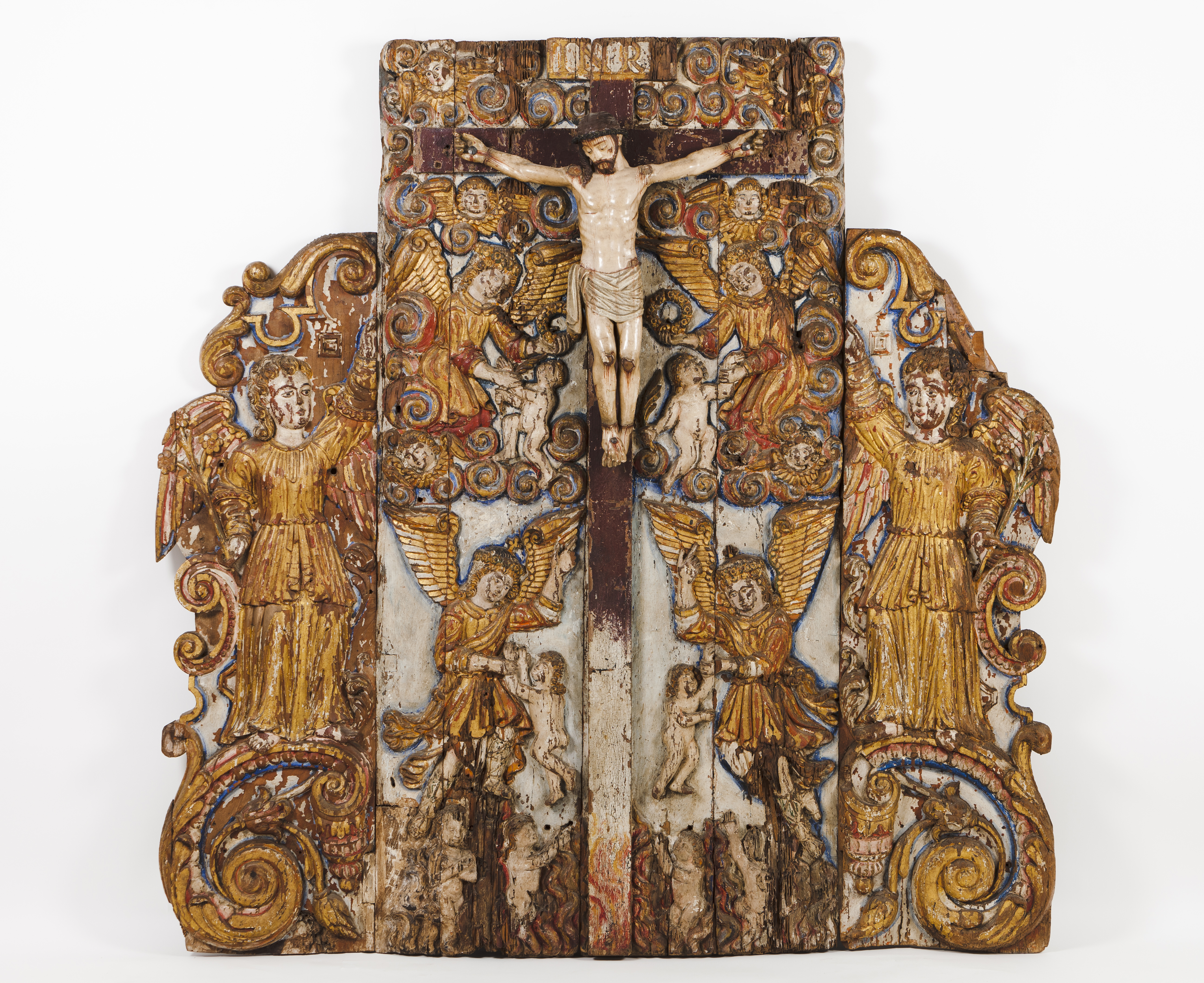 Em madeira entalhada, policromada e dourada representado cristo crucificado ao centro ladeado por Querubins, Anjos e Arcanjos