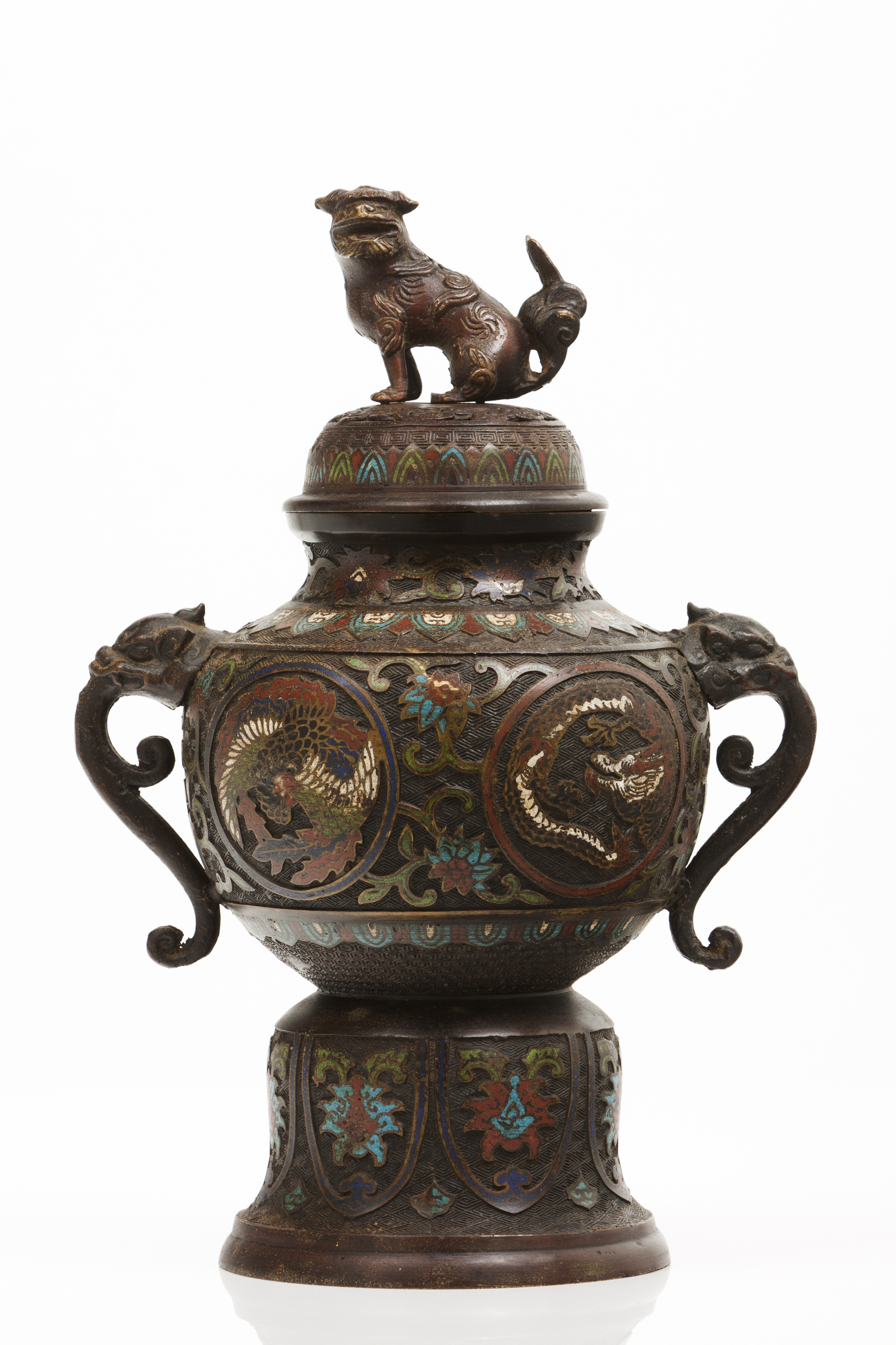 Decoração relevada com motivos geométricos e com cloisonné policromo representando motivos florais