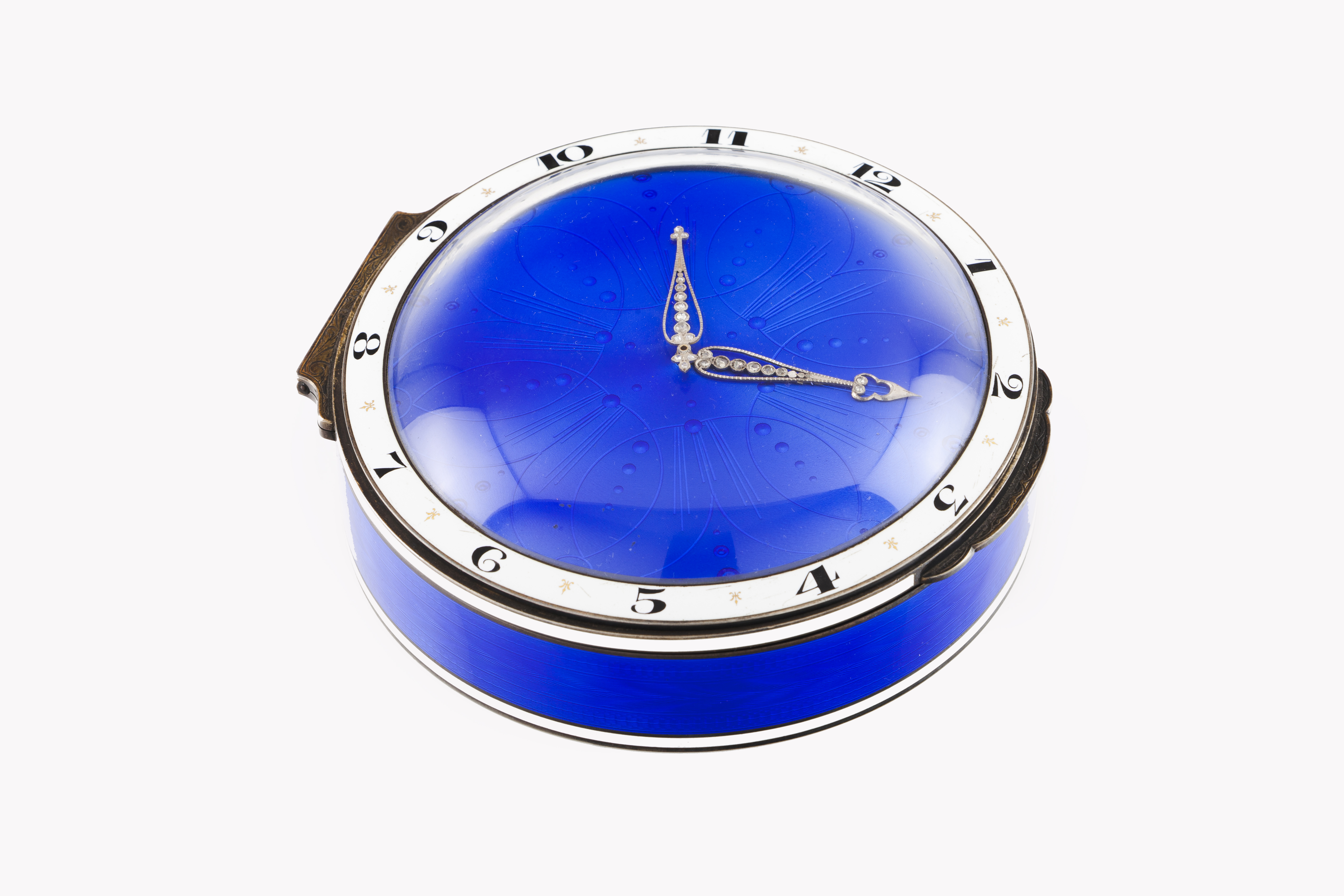 Formato redondo com decoração guilhochada e gravada esmaltada a azul cobalto sendo a tampa um indicador de horas em numeração árabe com ponteiros rendilhados cravejados com diamantes em talhe antigo de brilhante