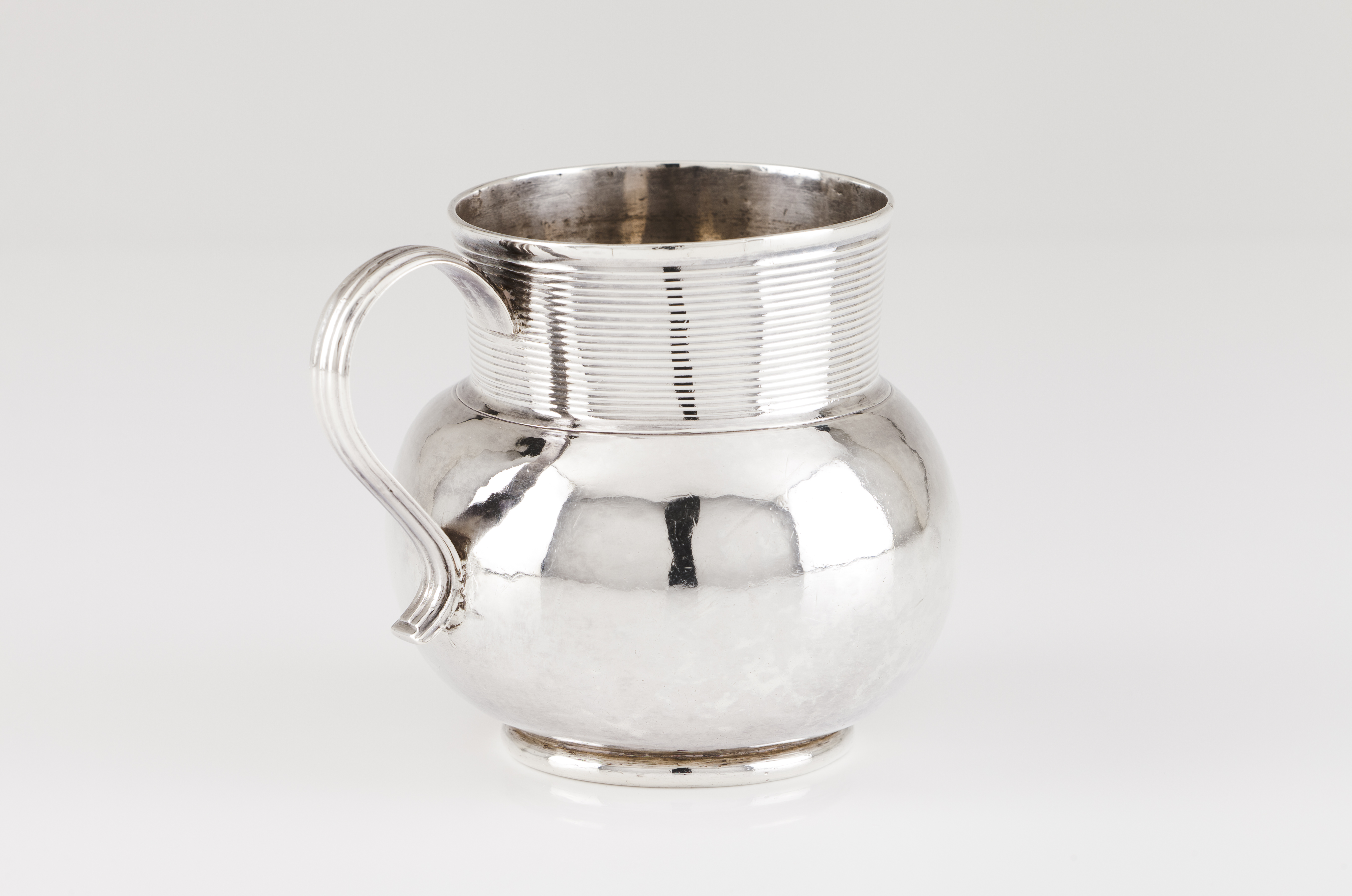 Bojo martelado, gola decorada com estrias transversais, pega em voluta com vincos