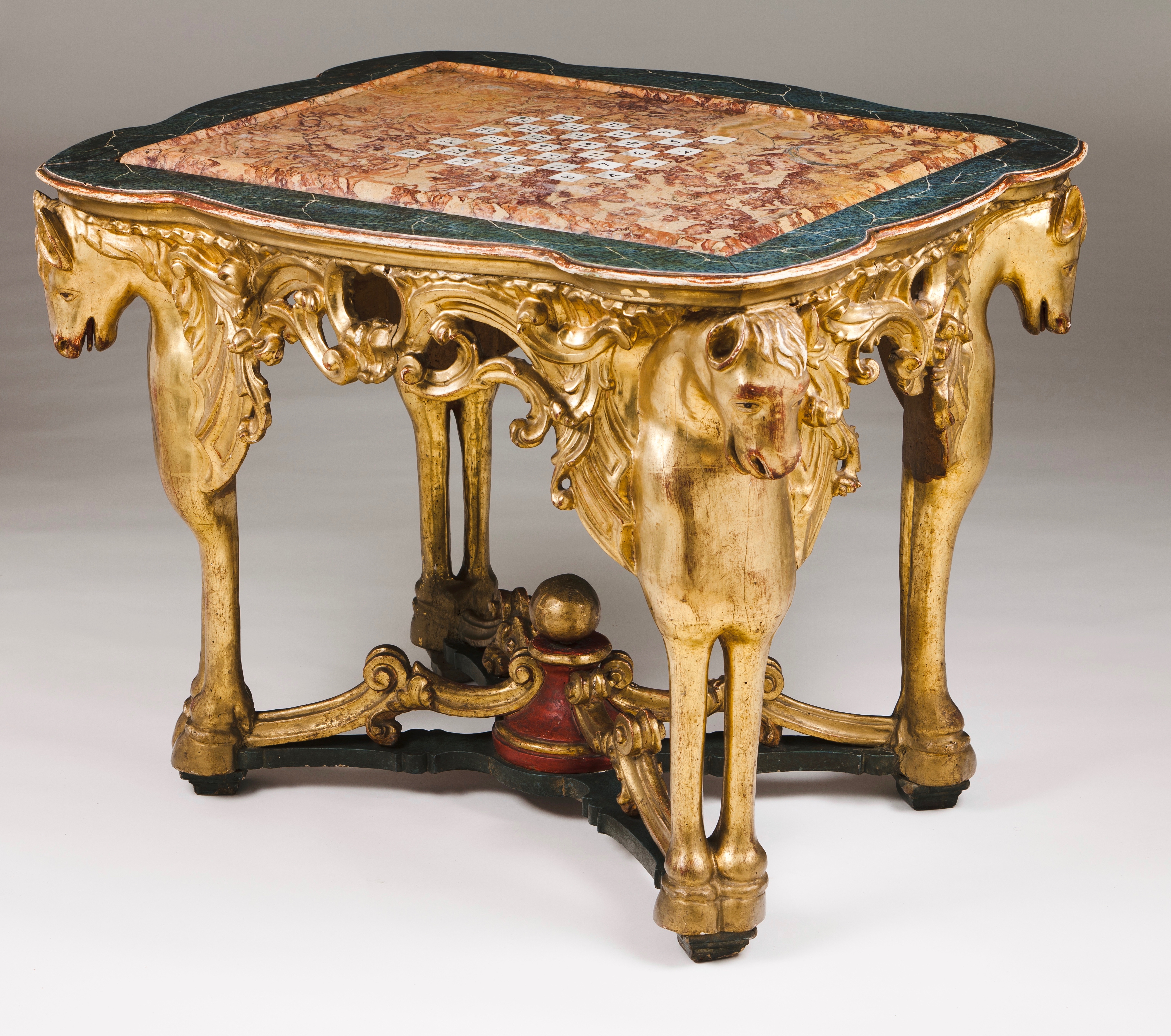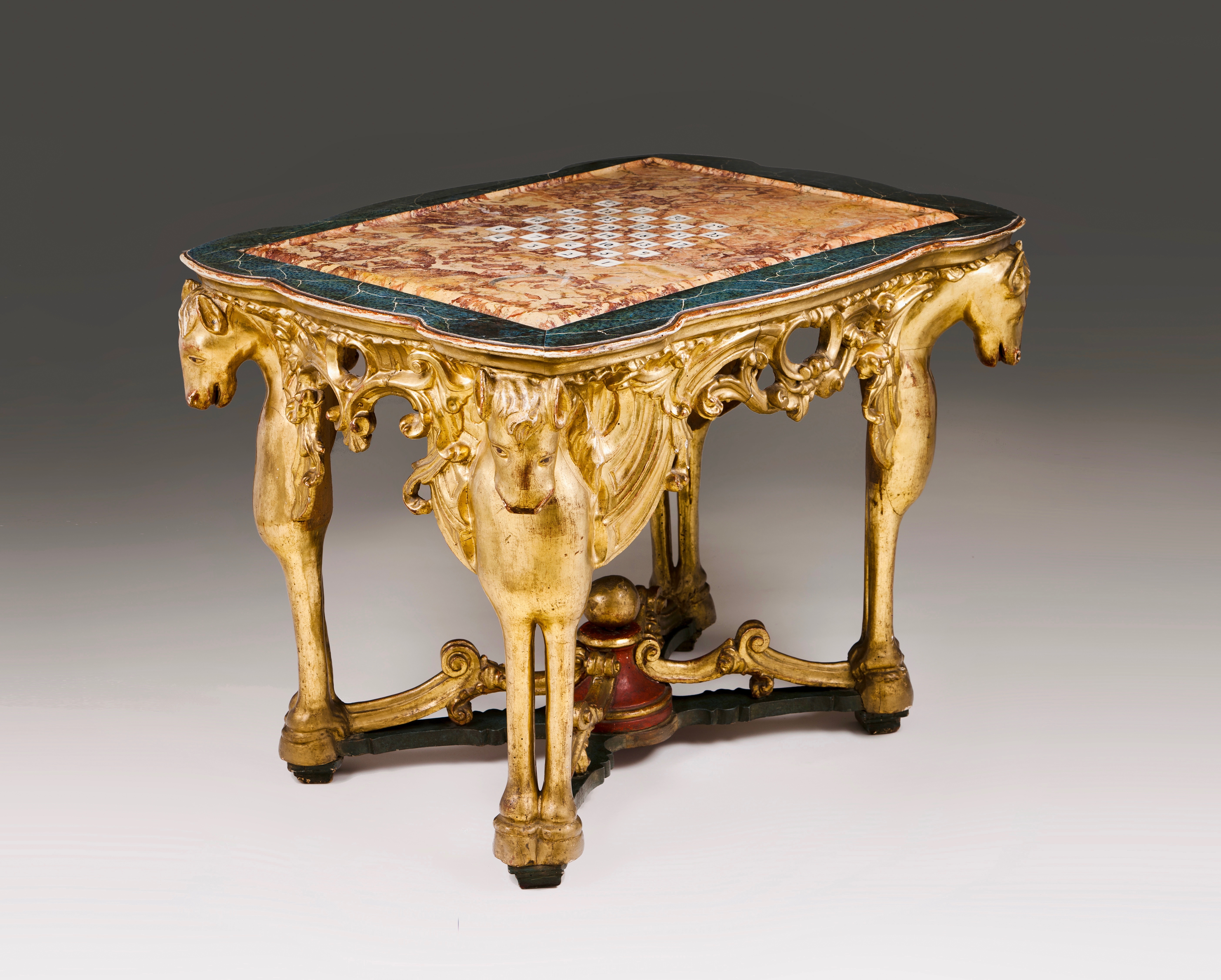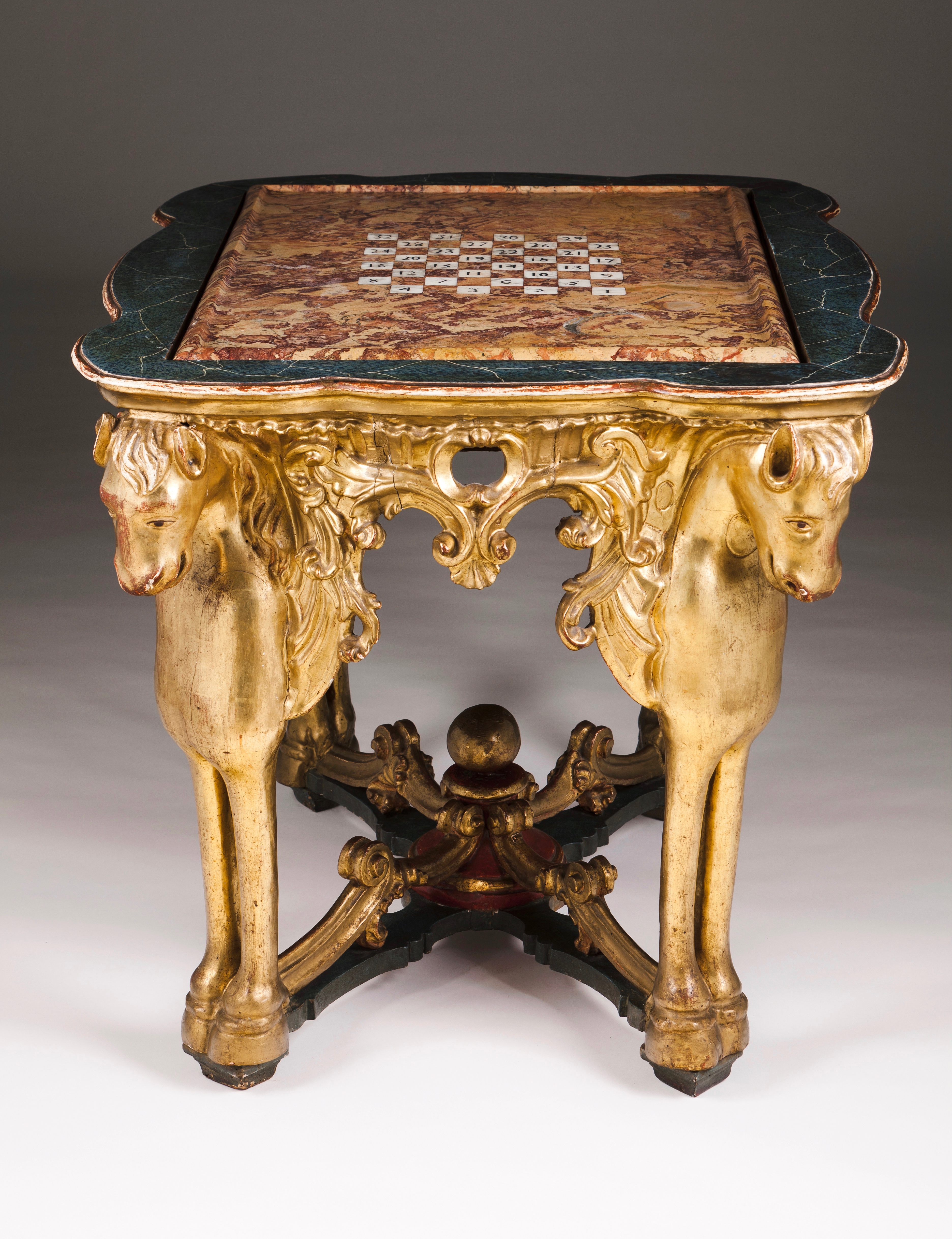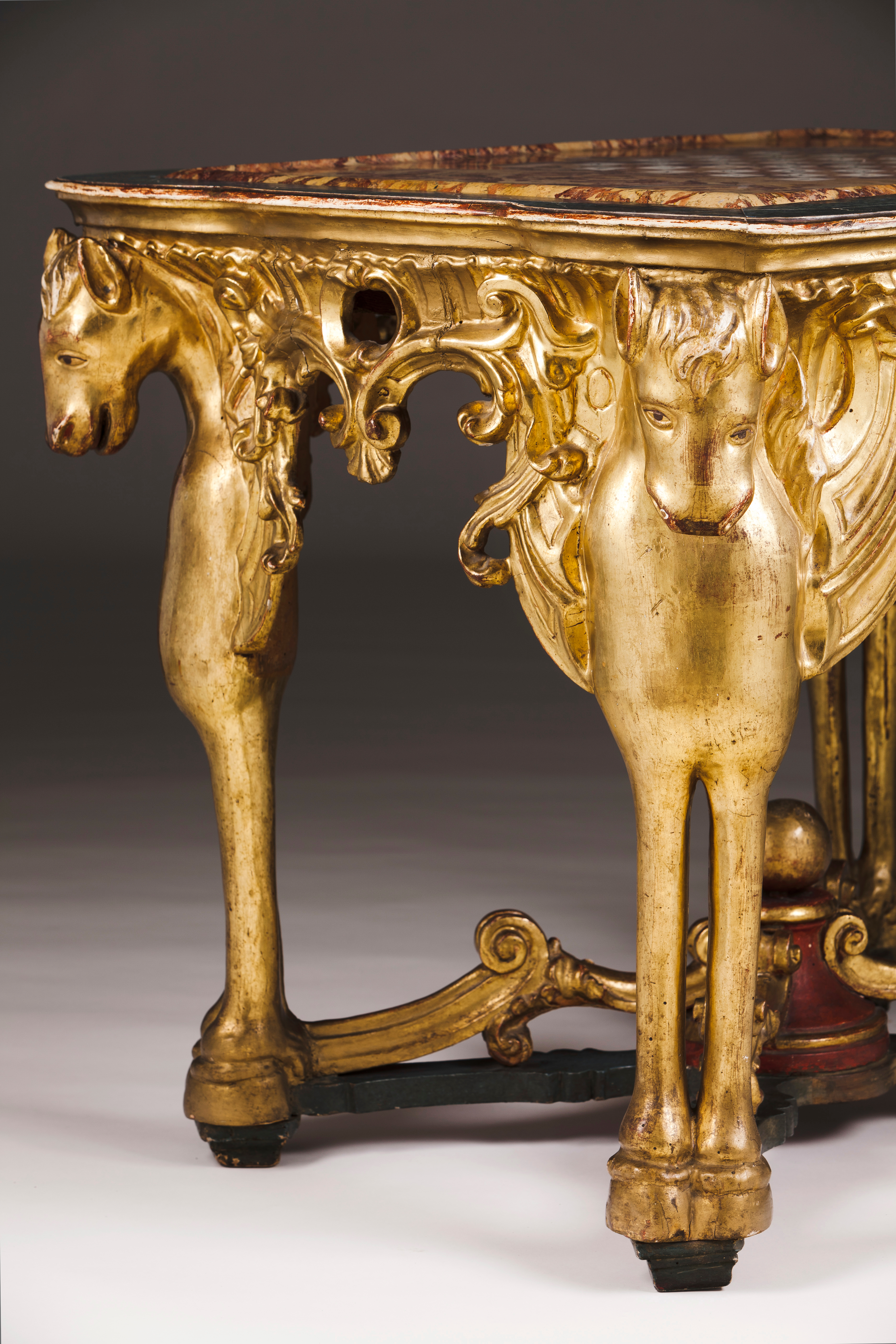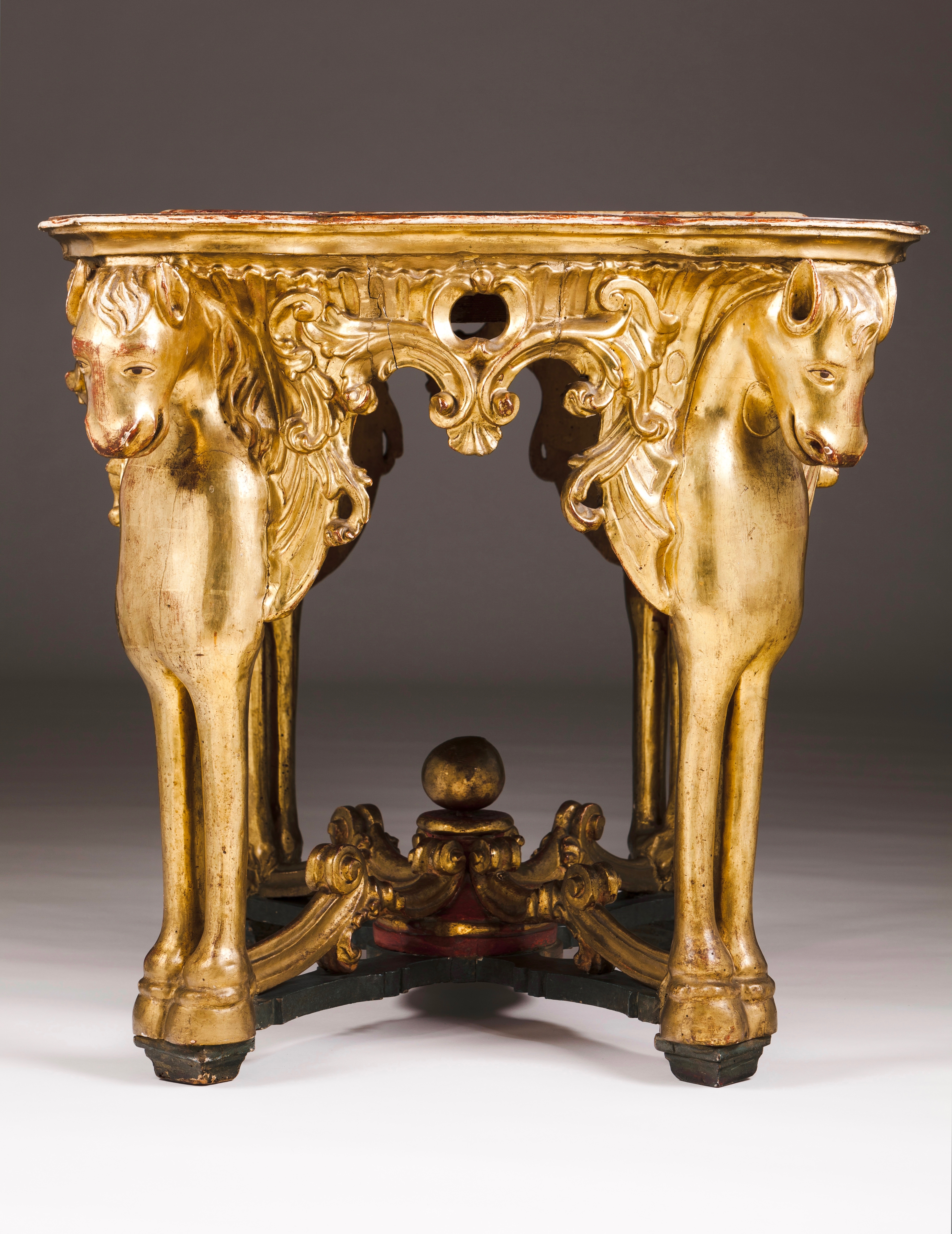 Assente em quatro pernas entalhadas e douradas a ouro fino representando cavalos alados, provavelmente os "Cavalos do Apocalipse"
