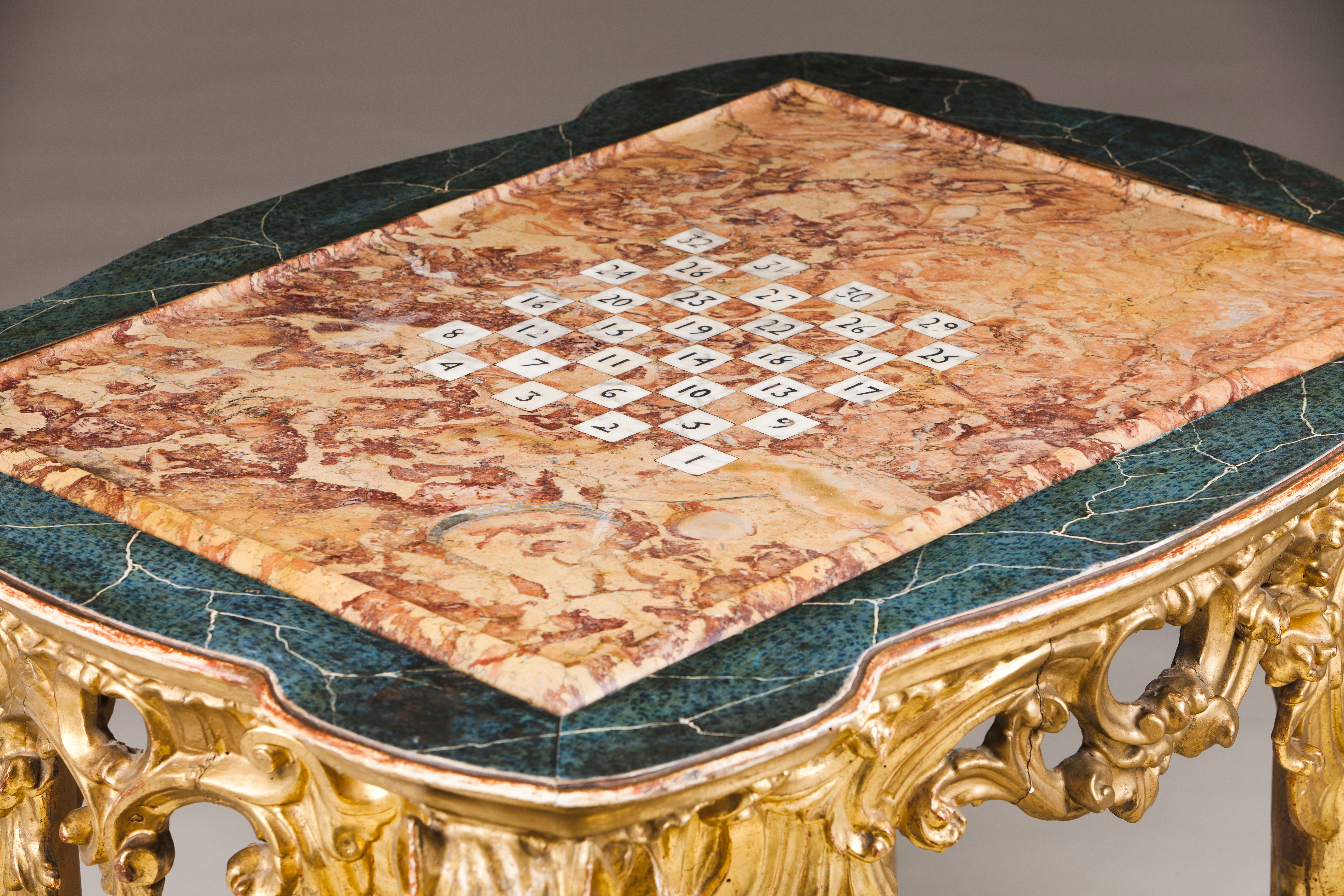 Tampo em pedra mármore com quadriculado de jogo embutido e numerado do 1 ao 32
