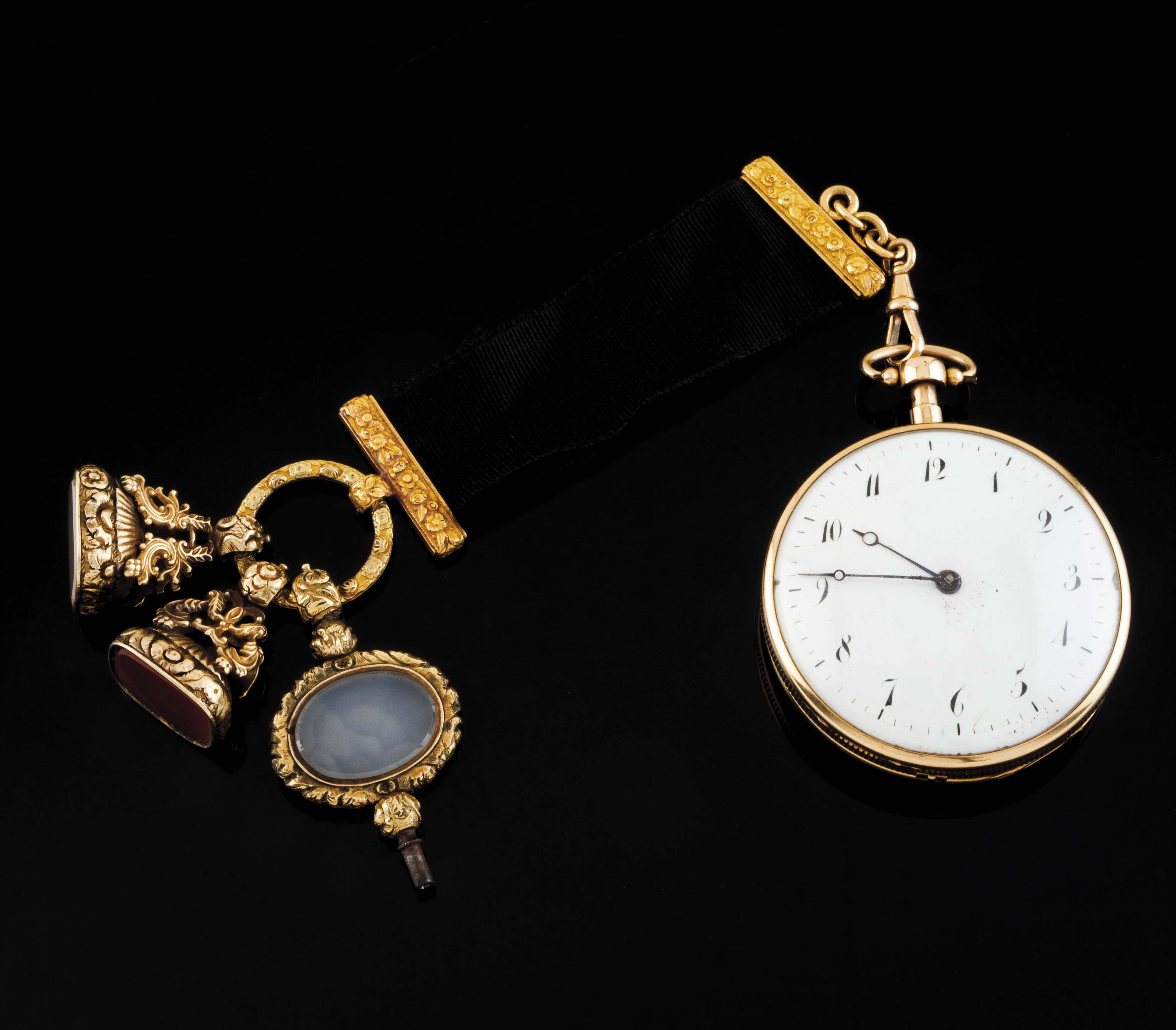 Chatelaine em fita de gorgorão e ouro com 3 berloques cravejados com ágatas, 2 para sinete e uma chave de corda em ouro de 18Kt