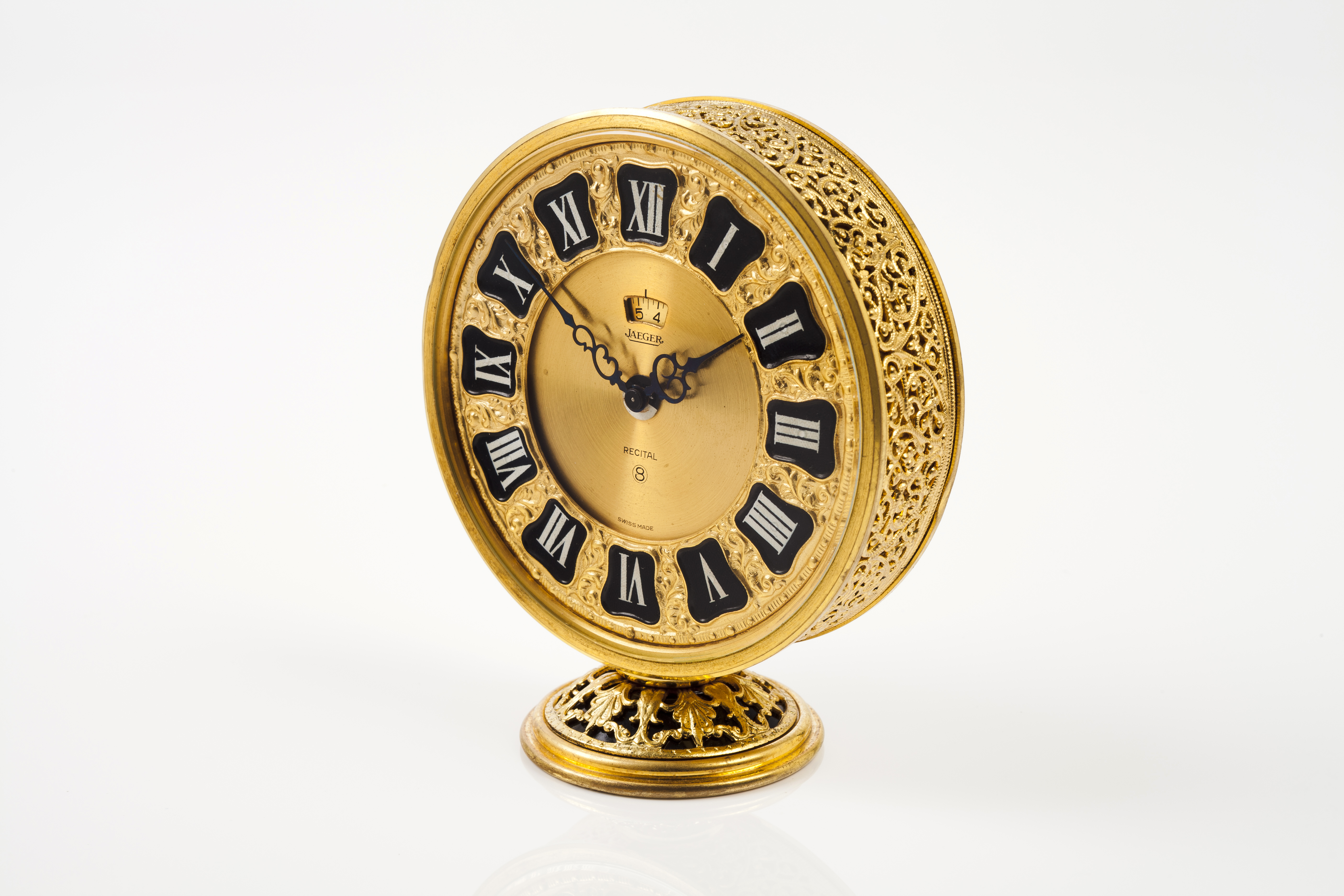 Raro relógio de mesa Jaeger, modelo recital todo em dourado e com 85mm de diâmetro de caixa por 100mm de altura. Movimento mecânico com corda de 8 dias e alarme de 24 horas. Relógio em bom estado, com ligeiríssimas marcas de uso.