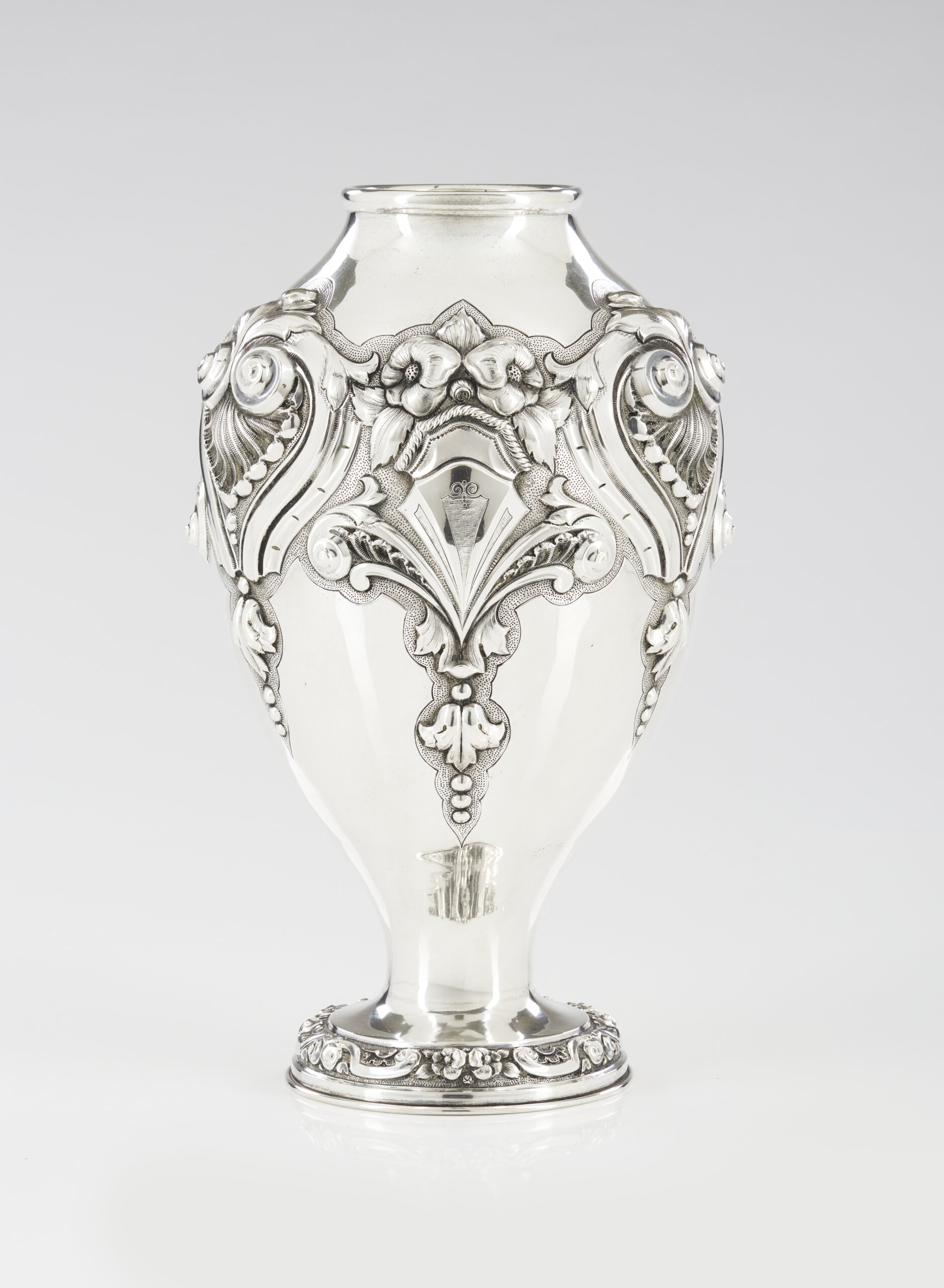 Decoração cinzelada e relevada representando Concheados e flores