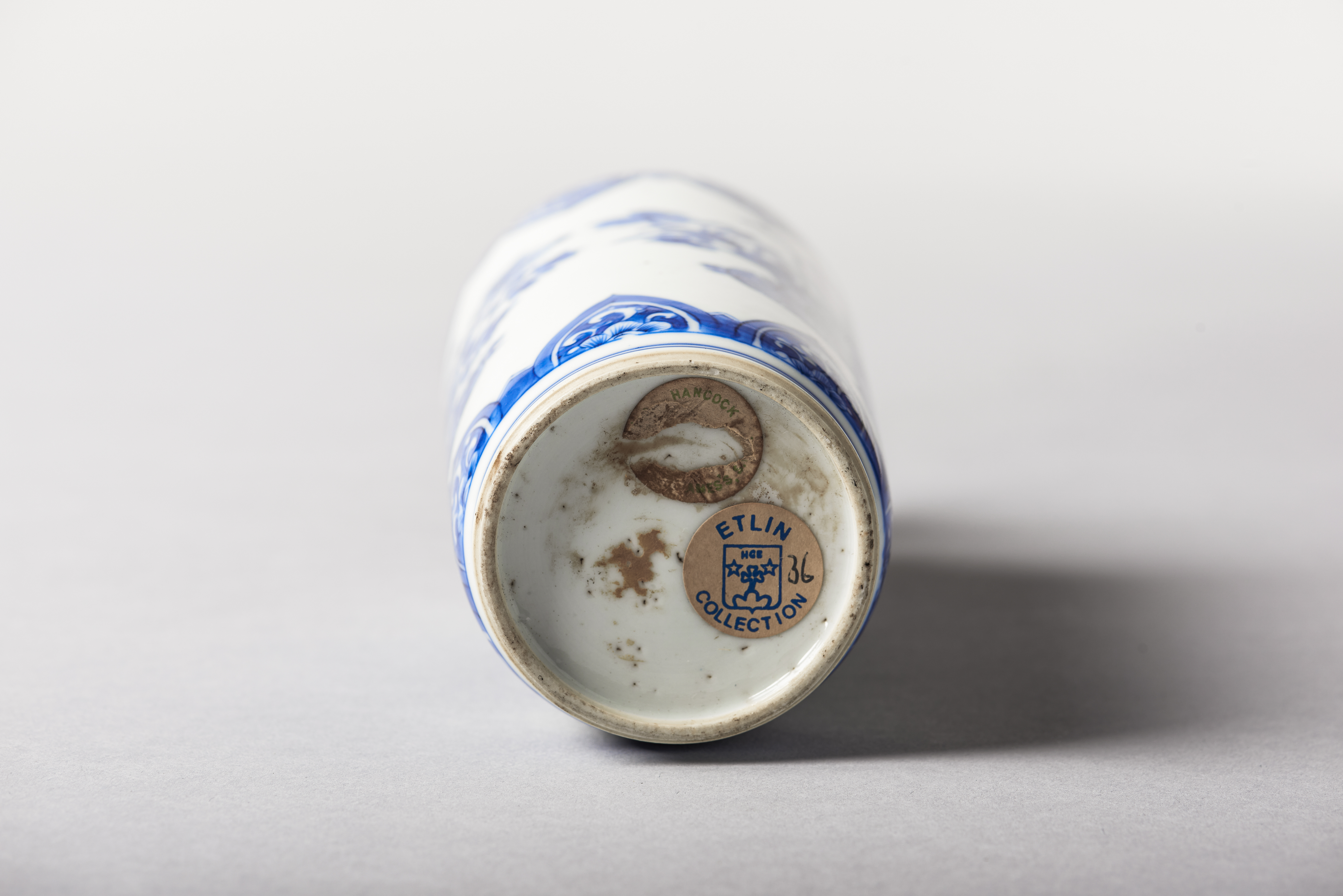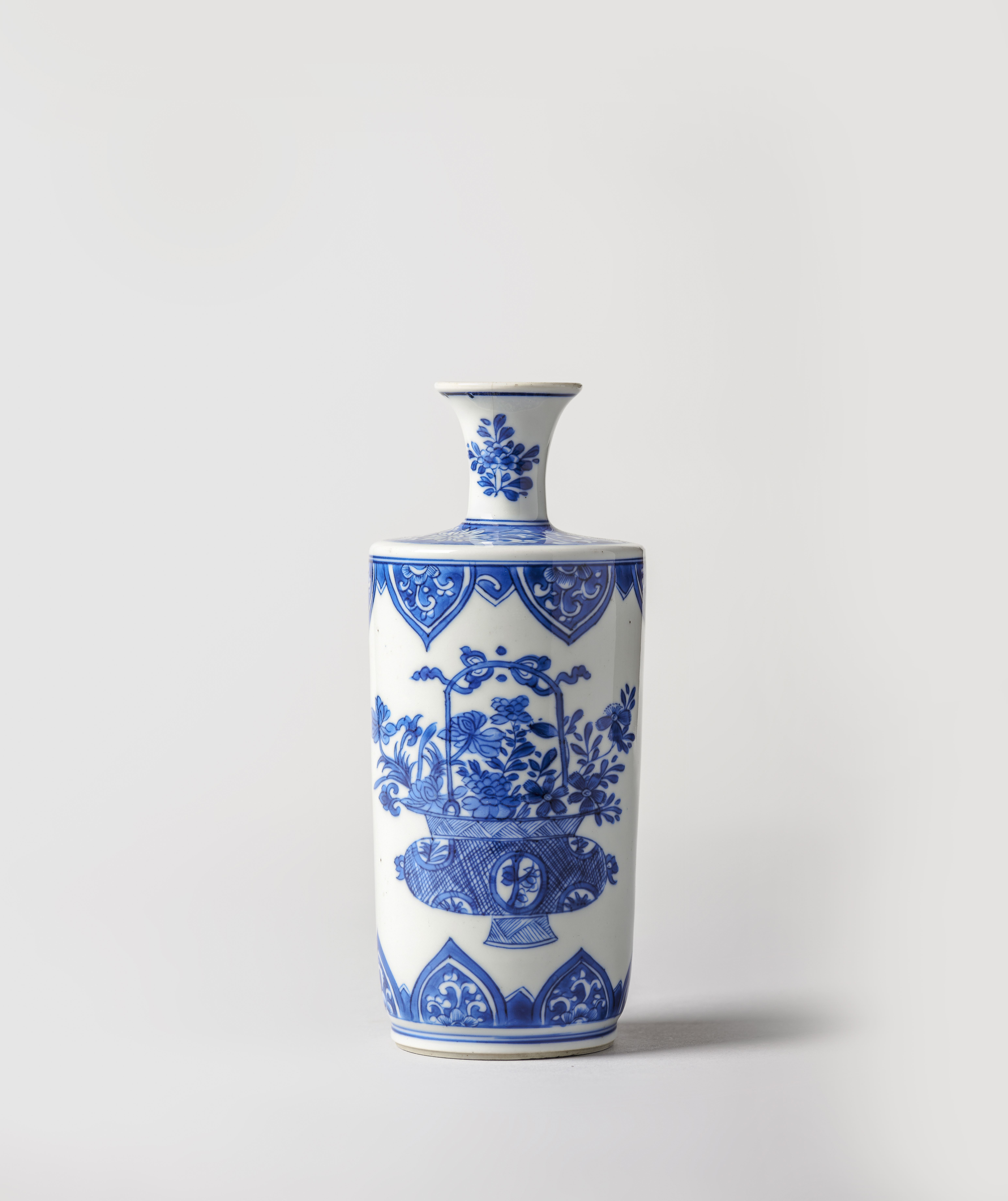 Em porcelana, com decoração a azul e branco, representando dois cestos com flores entre cercaduras de ruyi. Ombro pintado com enrolamentos de lótus reservados a branco sobre fundo azul e pescoço com ramos floridos.