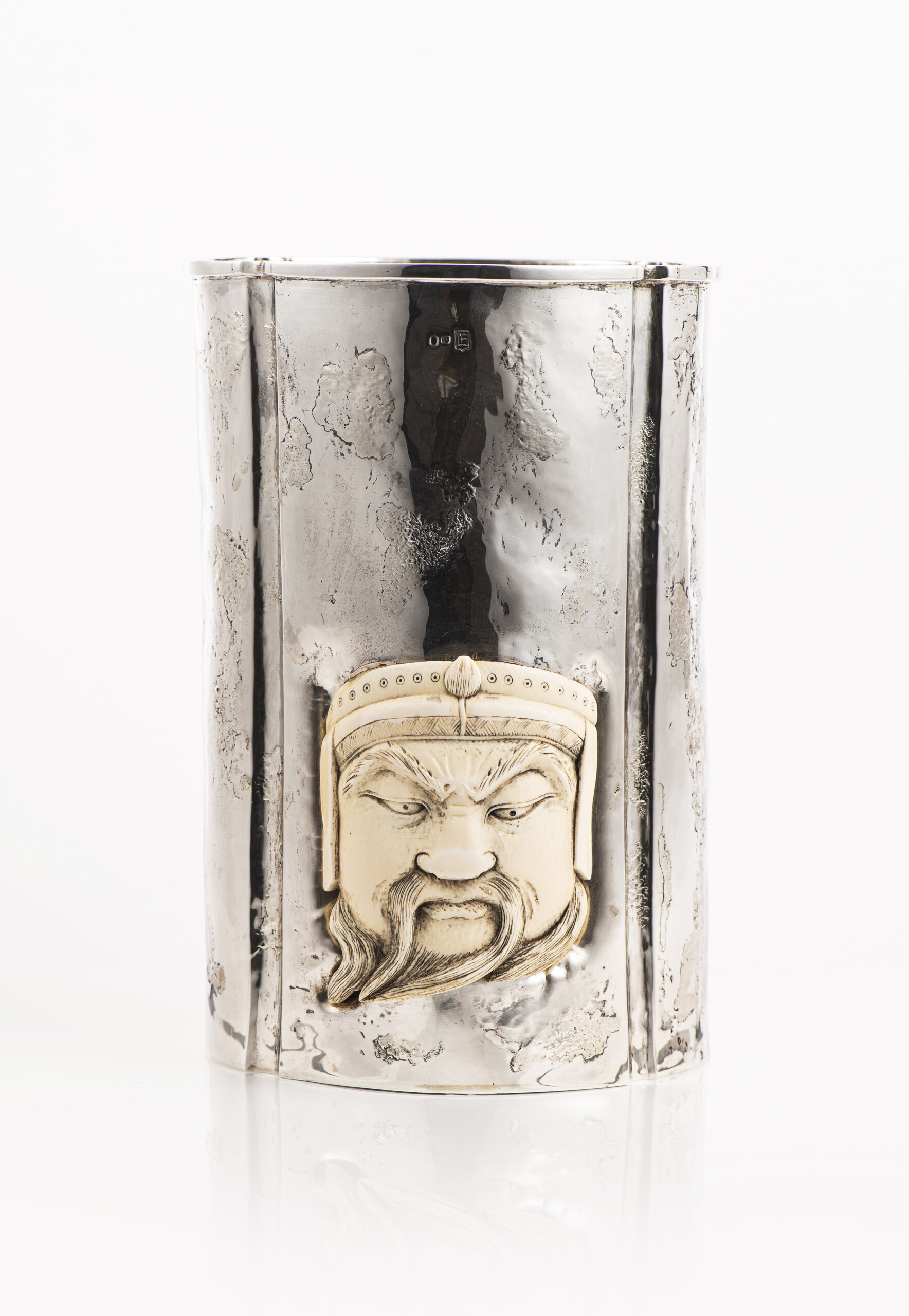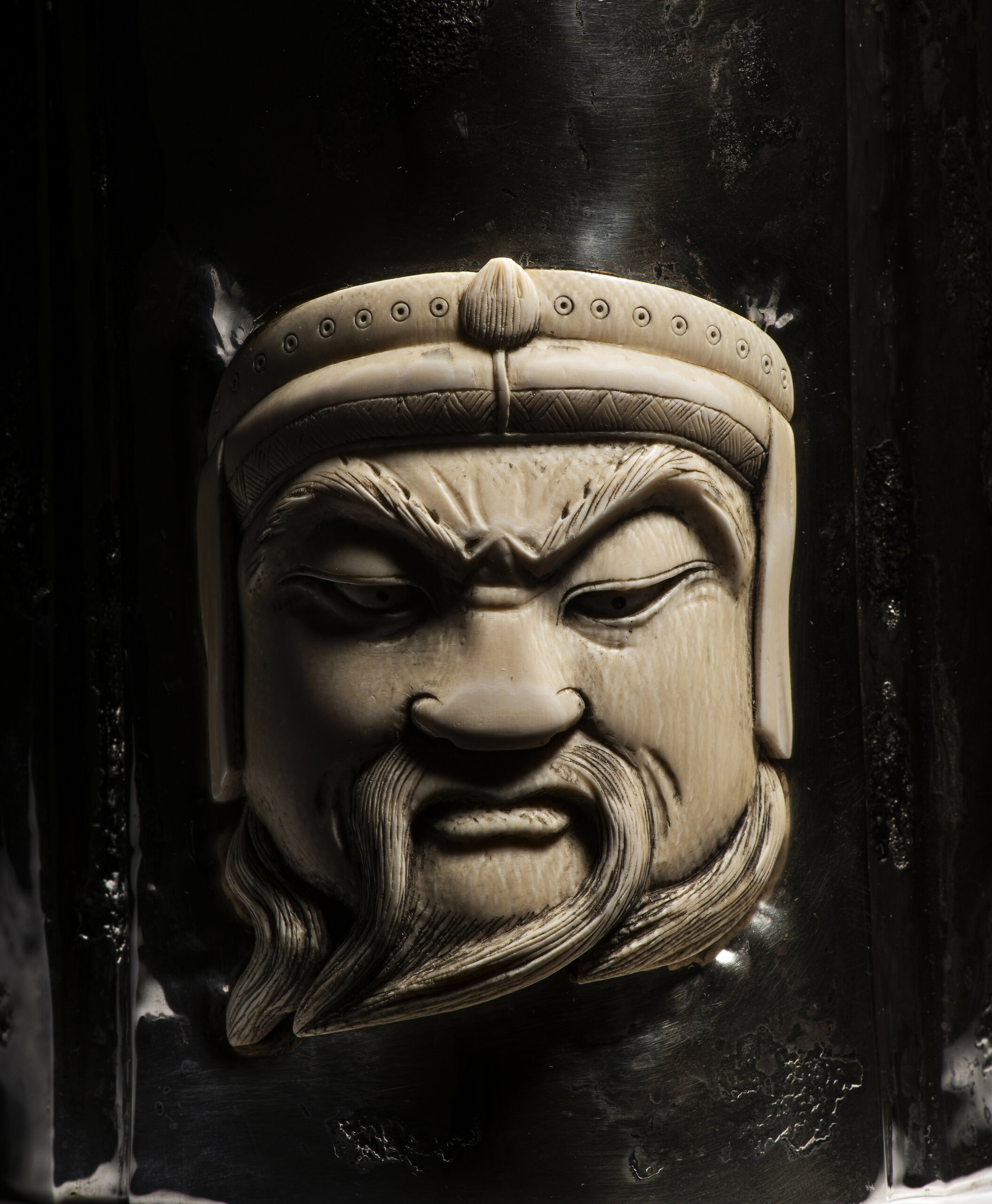 Aplicação de escultura esculpida em marfim representando máscara de guerreiro oriental