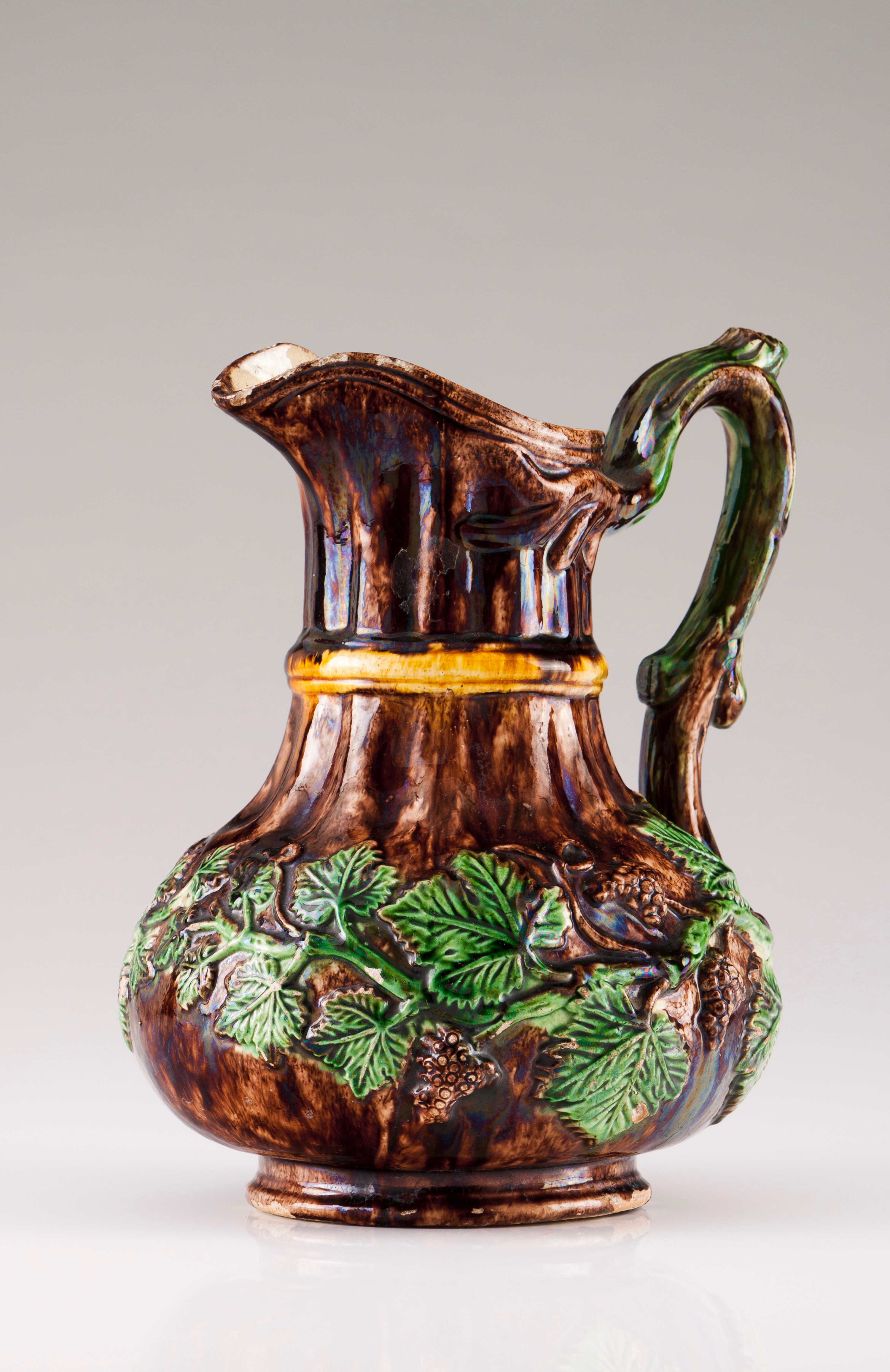 Decoração relevada em forma de ramo de videira com cachos de uva e vidrado em tons de castanho e verde