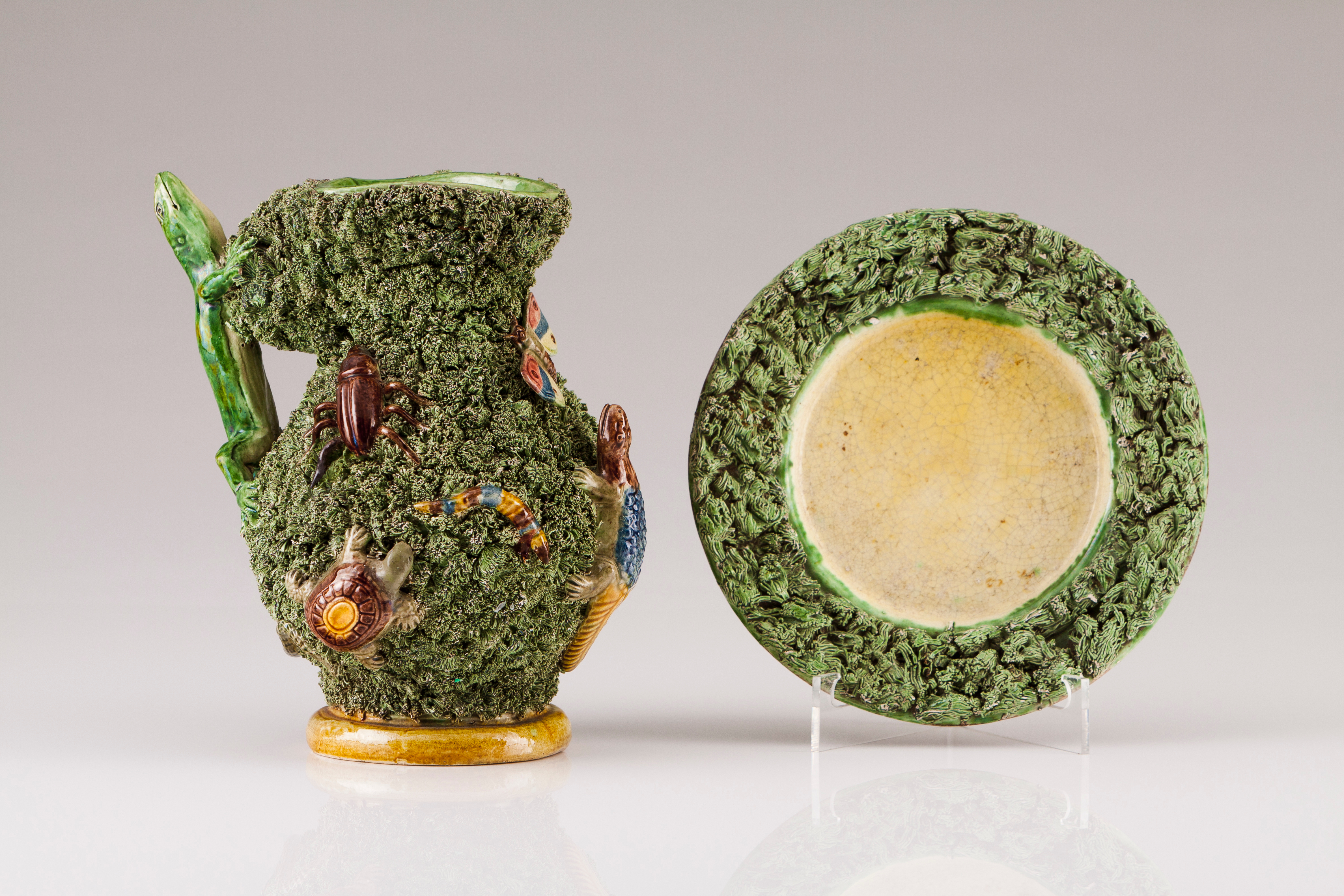 Decoração policromada e relevada em tons de verde e castanho representando répteis, insectos e musgo