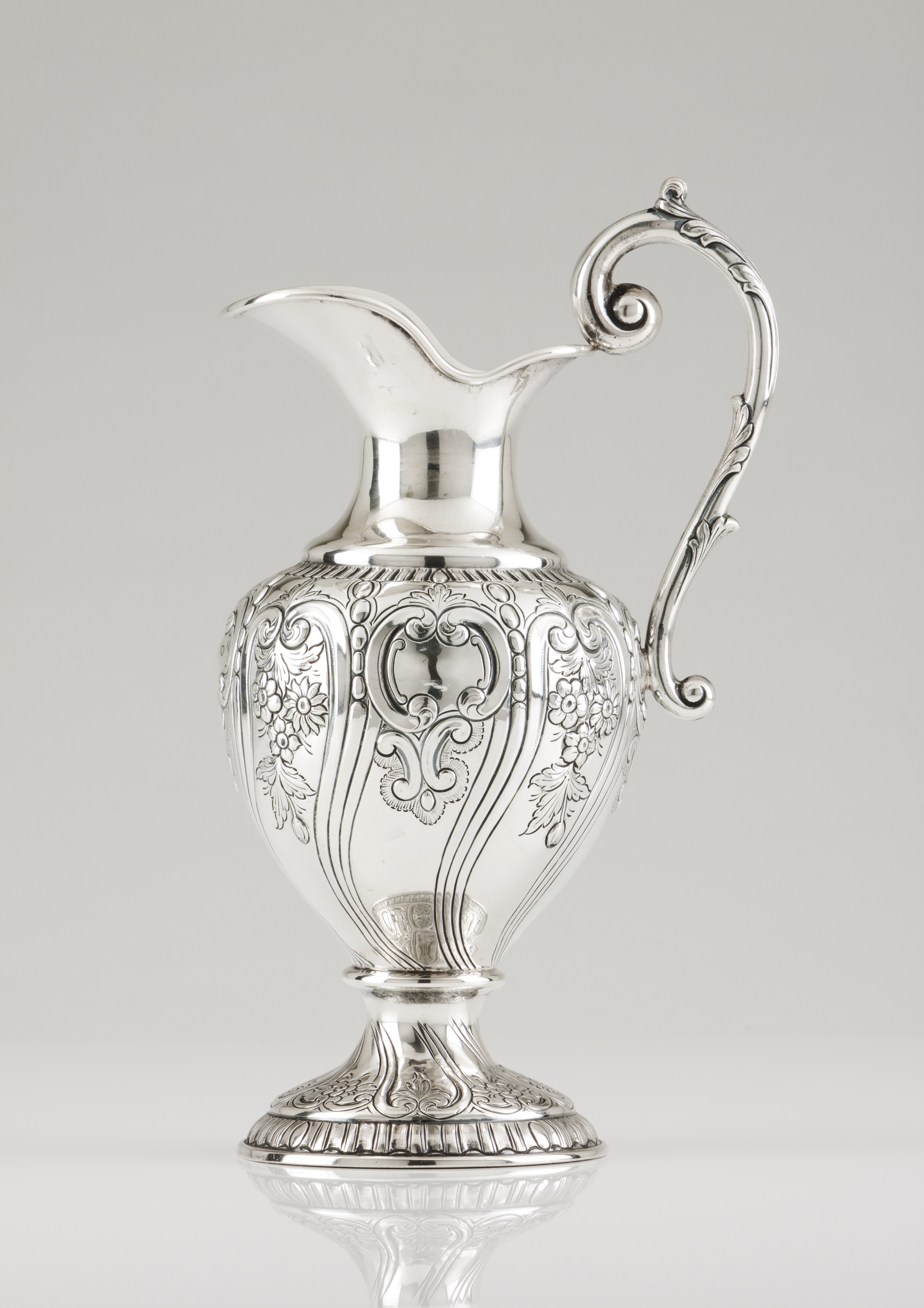 Corpo torneado com decoração relevada de motivos vegetalistas, reservas lisas, aletas e vincos espiralado