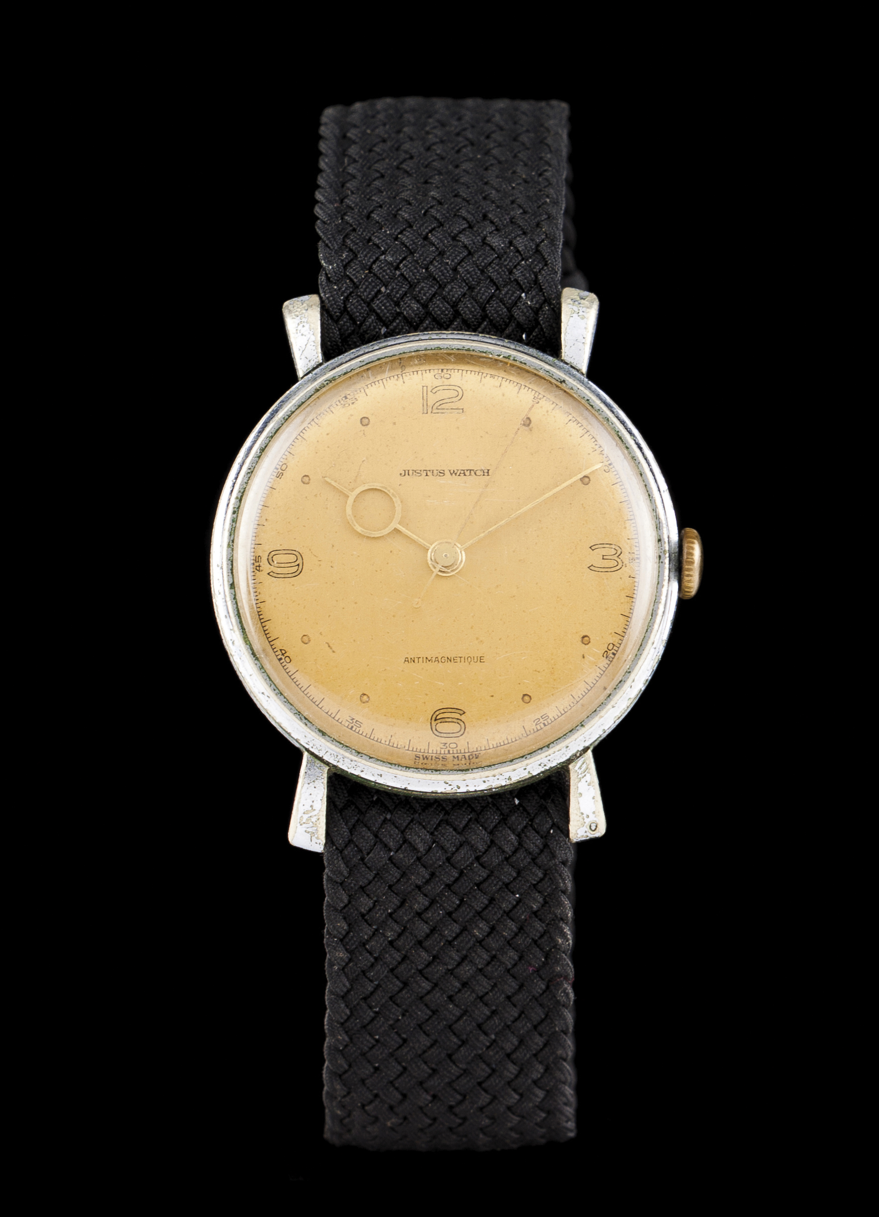 Relógio marca Justus, antimagnetique. Movimento mecânico de corda manual. Mostrador apresenta escala periférica de segundos. Caixa cromada com tampa em açode pressão. Com bastante uso aparente