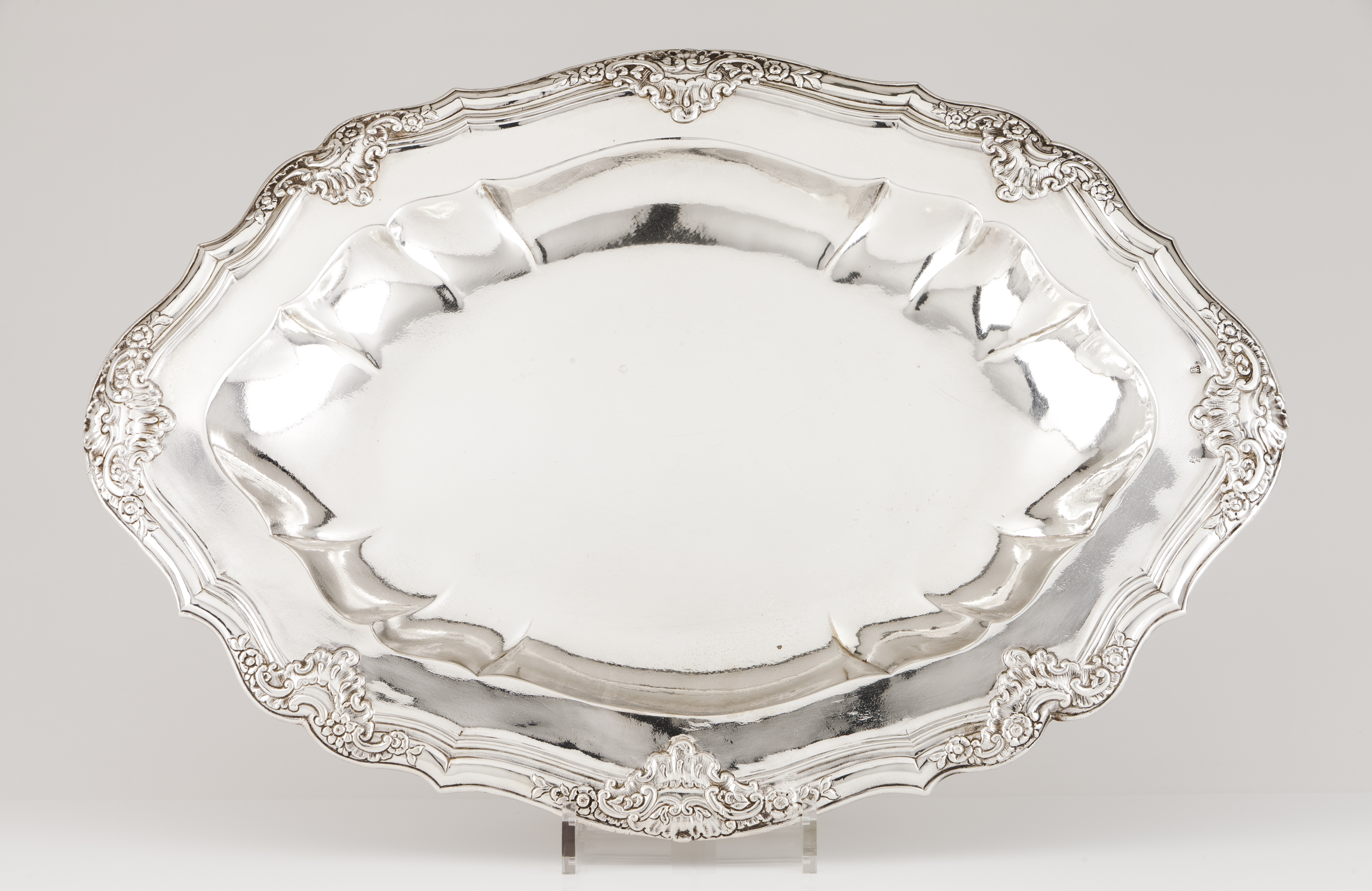 Em formato elíptico, fundo liso vincada com gomos largos, aba decorada com com friso recortado e decoração relevada de acantos, aletas e flores