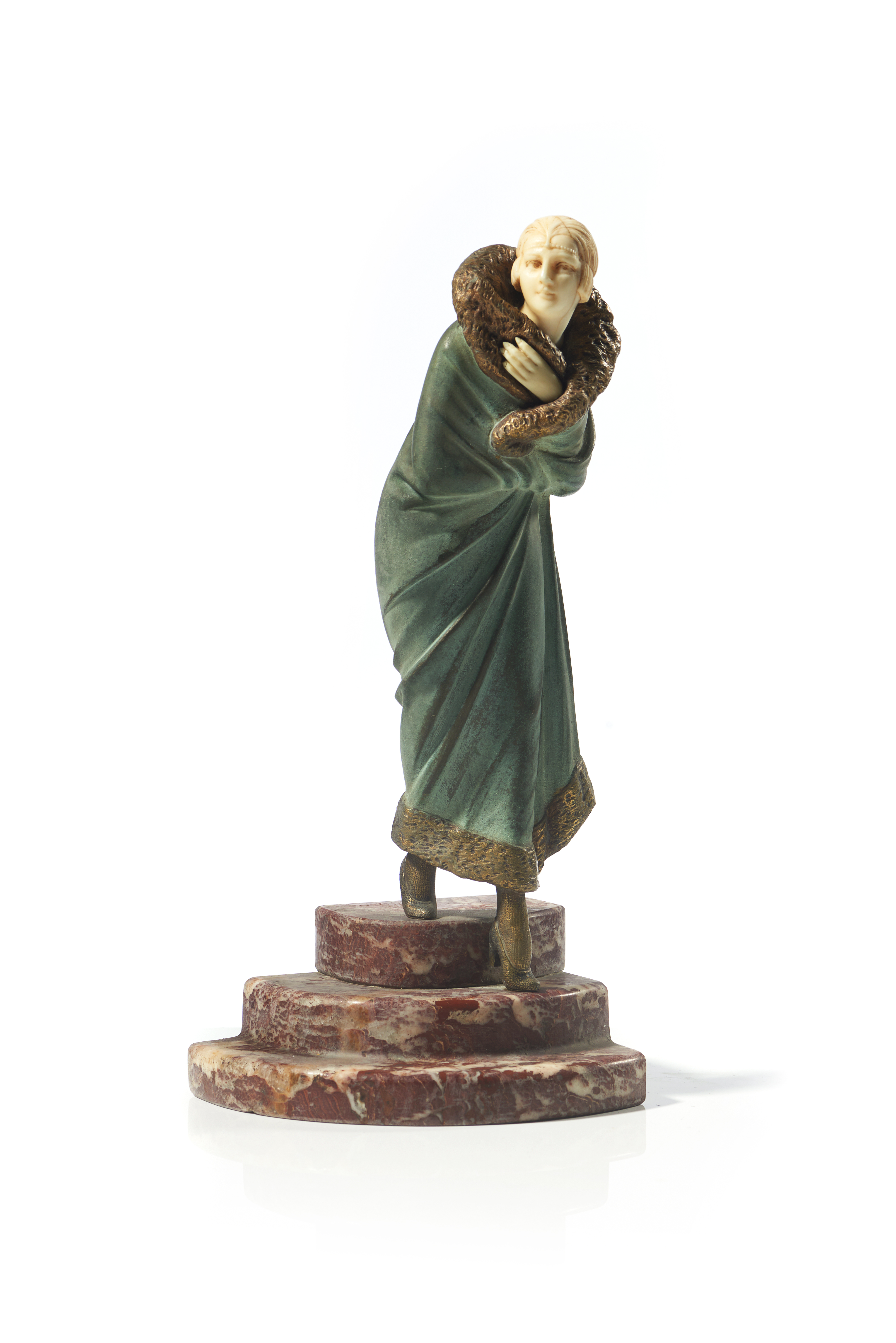 Escultura Art Déco em bronze patinado com cabeça e mão em marfim