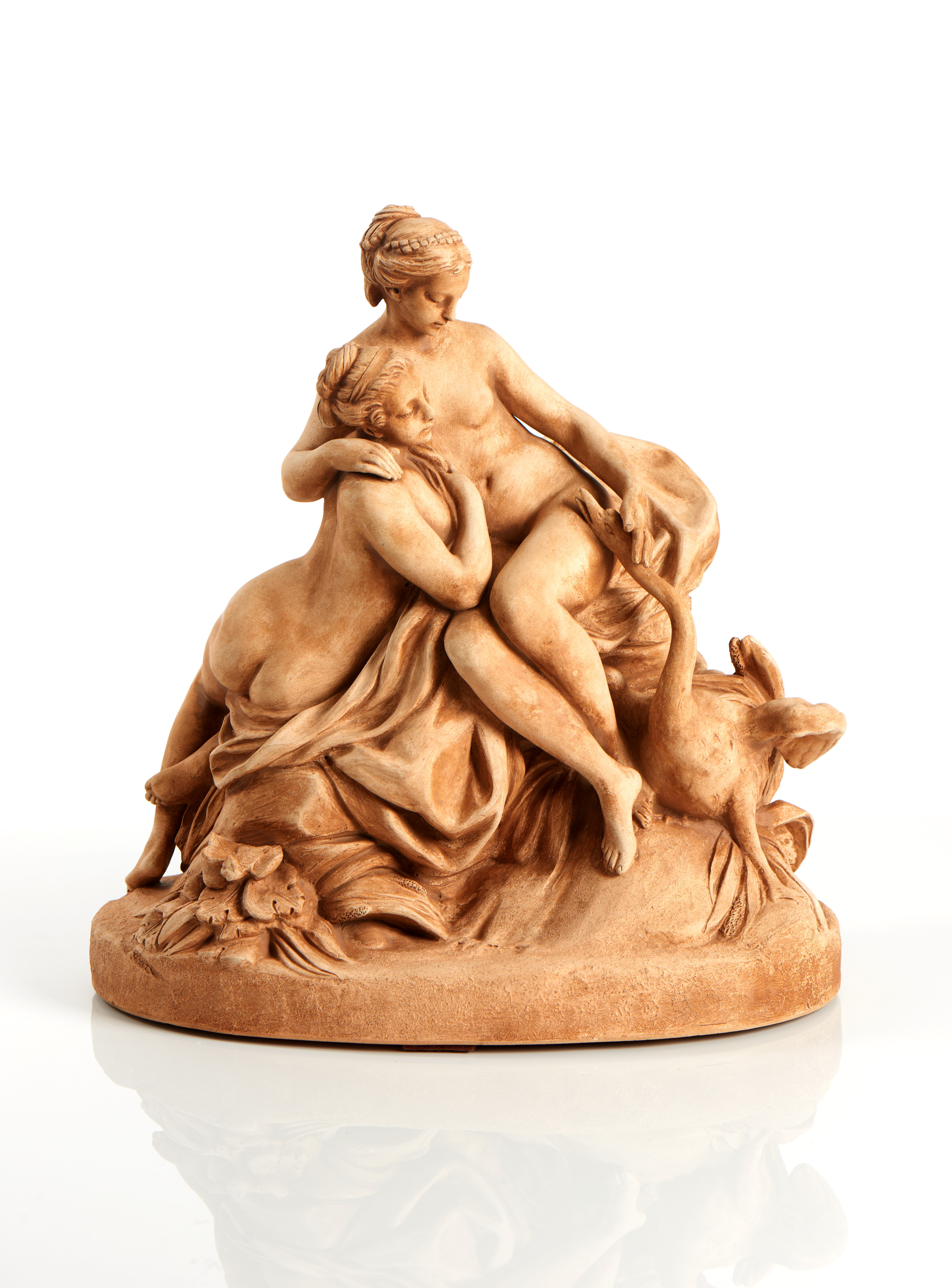 Esta escultura de FALCONNET foi inspirada pela pintura de François BOUCHER, "Le cygne s'approche de Léda et de sa suivante sortant du bain" (Museu Jean de la Fontaine, Château-Thierry). Trata-se provavelmente de um modelo para uma escultura monumental ou para uma ser transferido para porcelana. Marcada na base com dois Ls entrelaçados e 90.