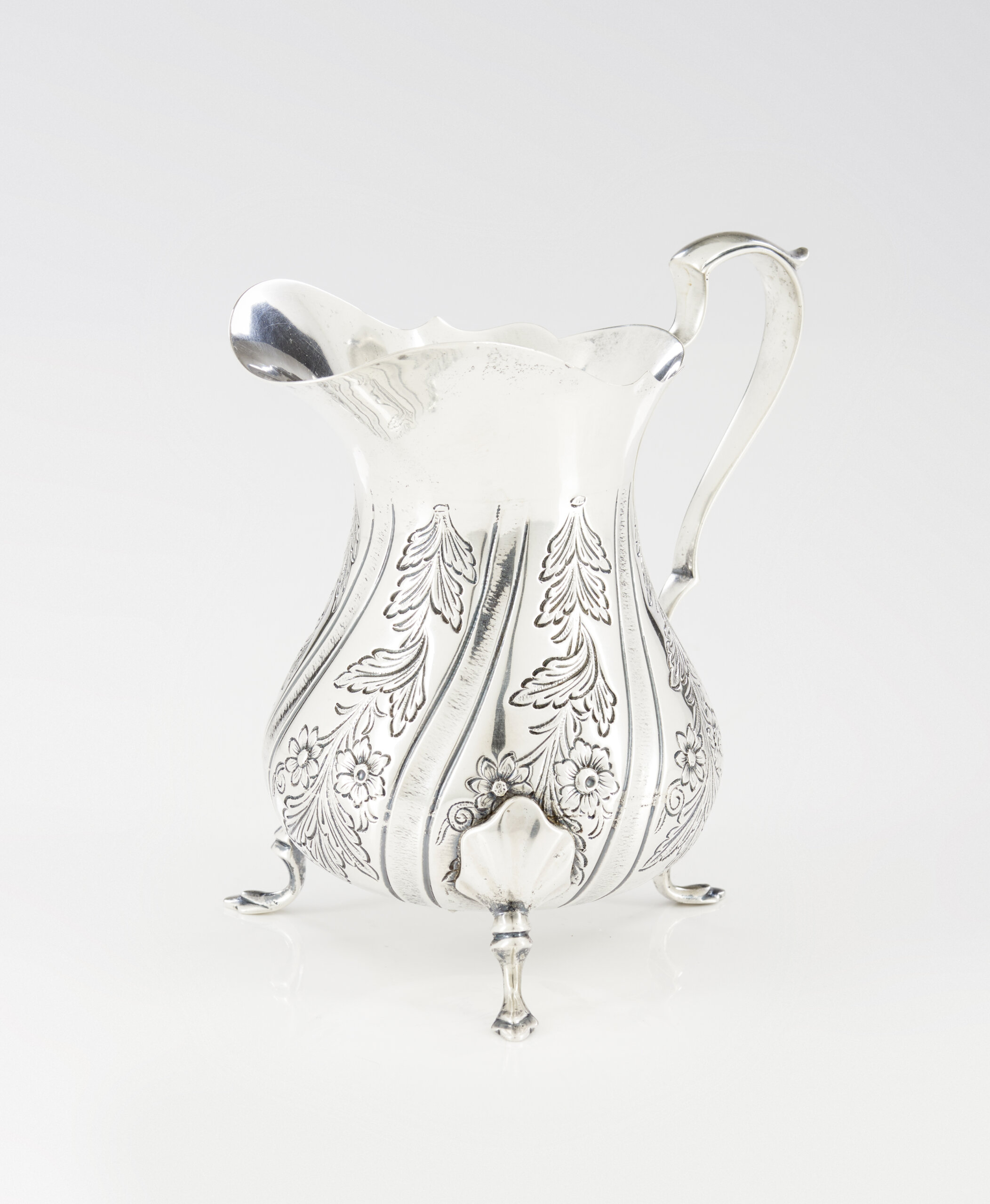Boca recortada, asa em voluta com remate de folha, assente em pés de sapata