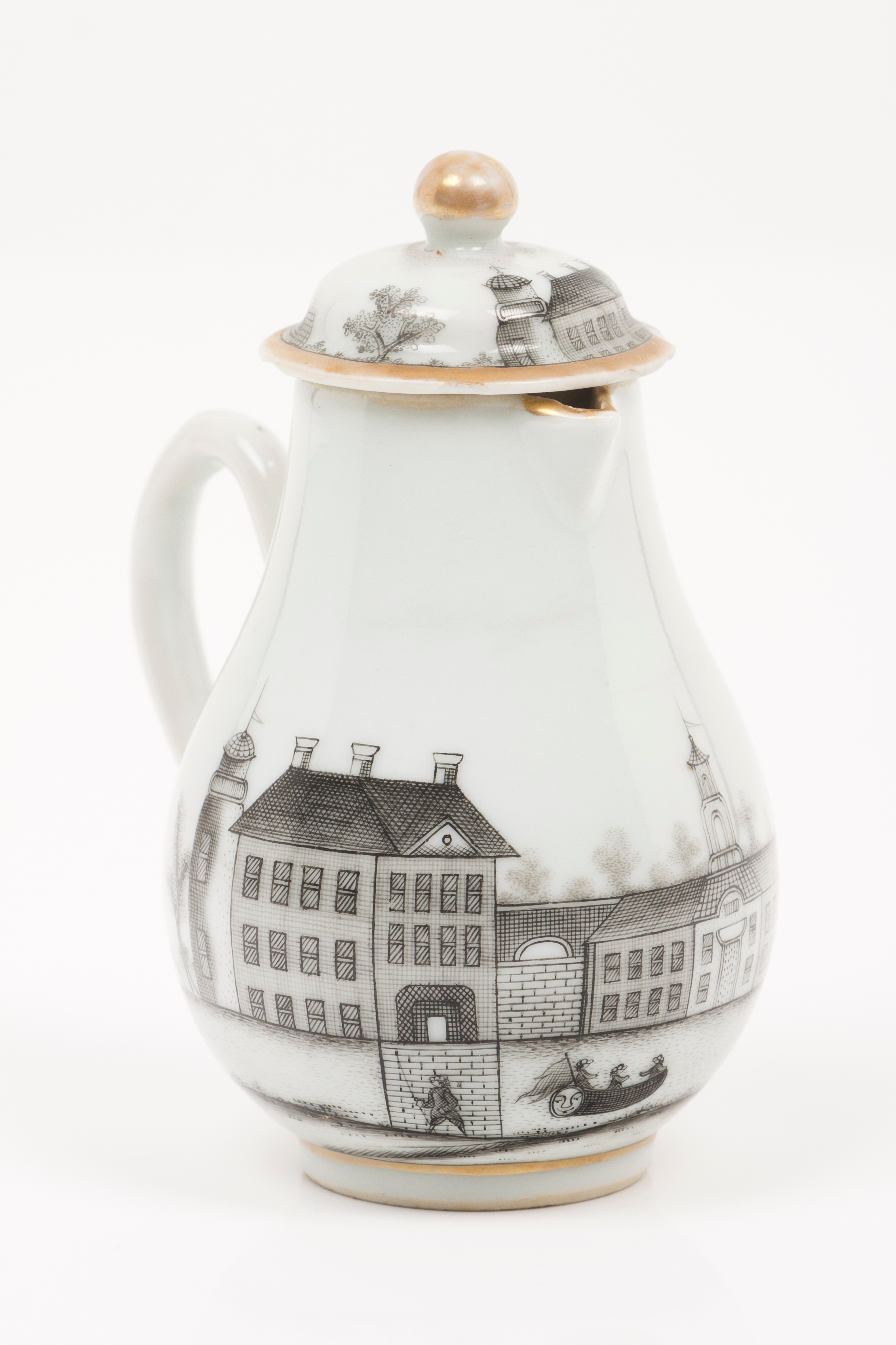 Leiteira com decoração a grisaille , representando paisagem com casario, barcos e figuras e chávena com decoração a grisaille representando deusa Juno, segurando gravura de Claude III Audran