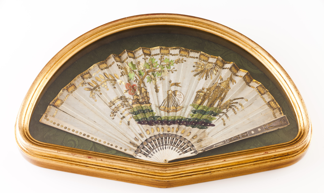 Com varetas em osso gravado, folha em seda bordada com lantejoulas