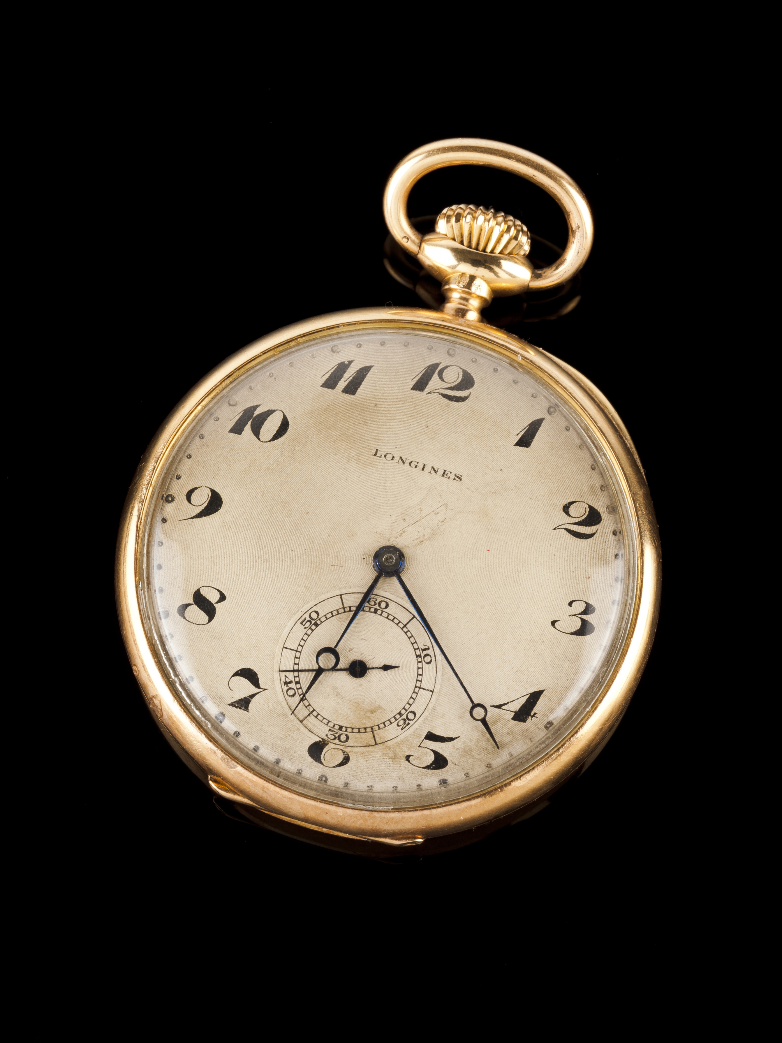 Relógio de Bolso Longines com caixa em ouro (750/000) com 46mm de diâmetro. Movimento mecânico de corda manual. Relógio produzido em 1907. Bem conservado com ligeiras marcas de uso.