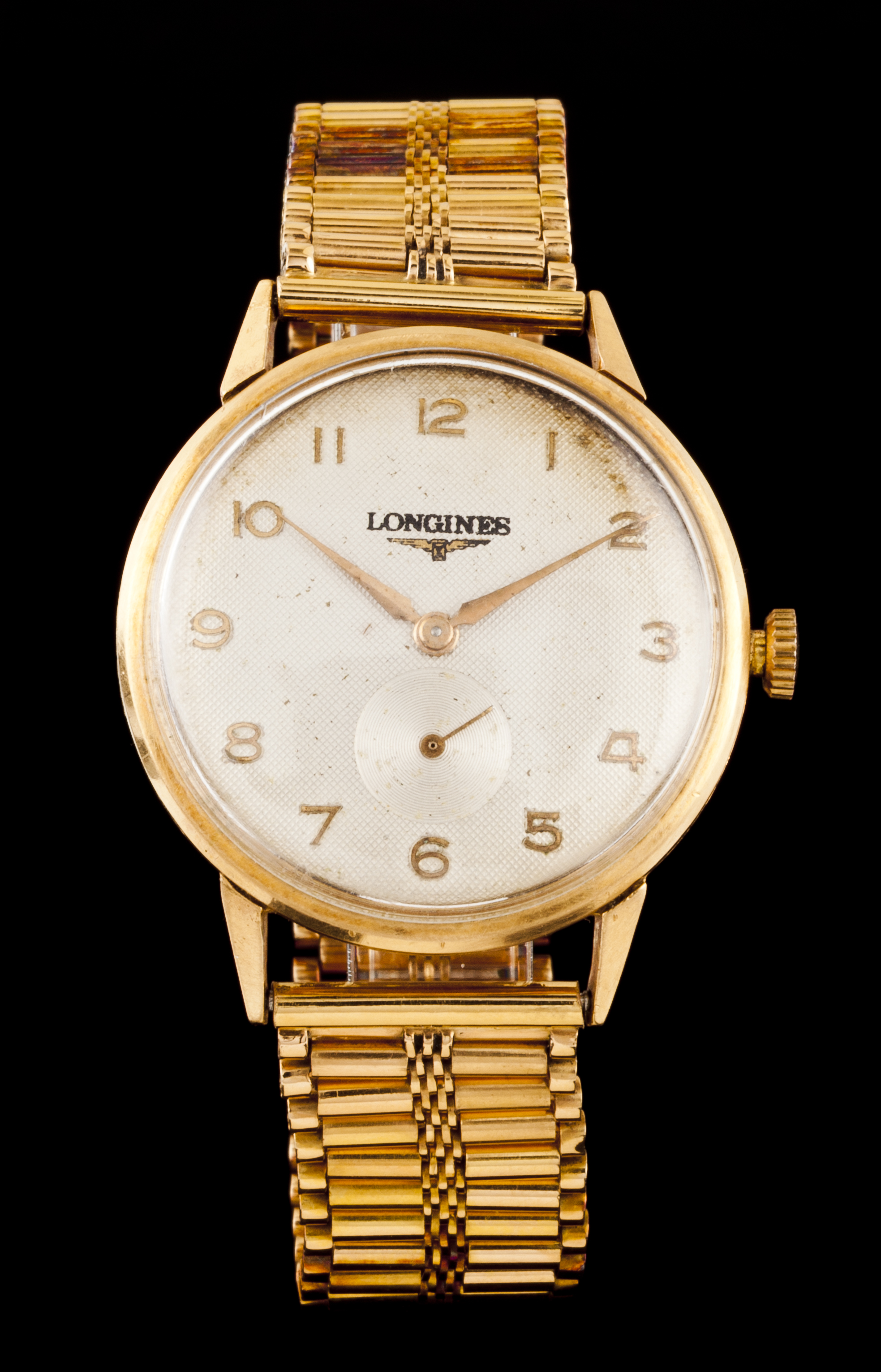 Relógio Longines com caixa em ouro de 18k e bracelete em ouro de 19k. Caixa de 36mm de diâmetro. Movimento mecânico de corda manual com segundos às 6 (movimento não assinado). Marcas de uso.