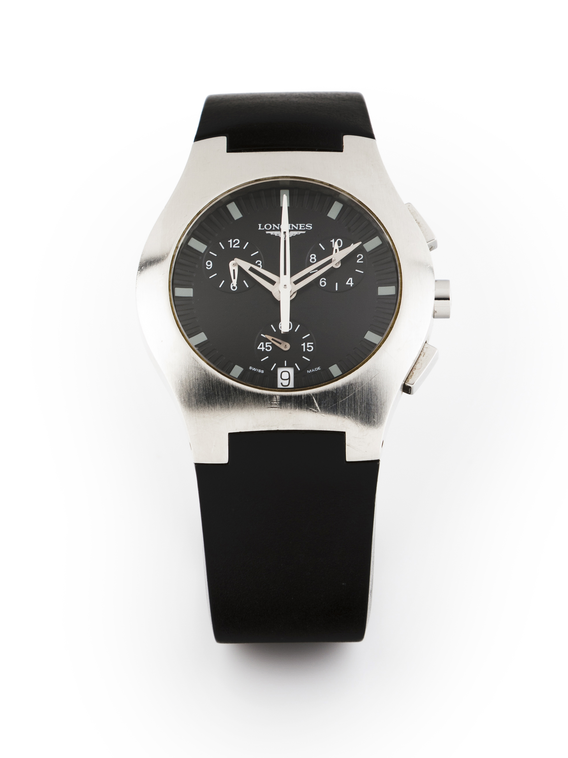 Movimento de quartzo com função cronógrafo e data às 18h. Caixa em aço. Em bom estado de conservação.