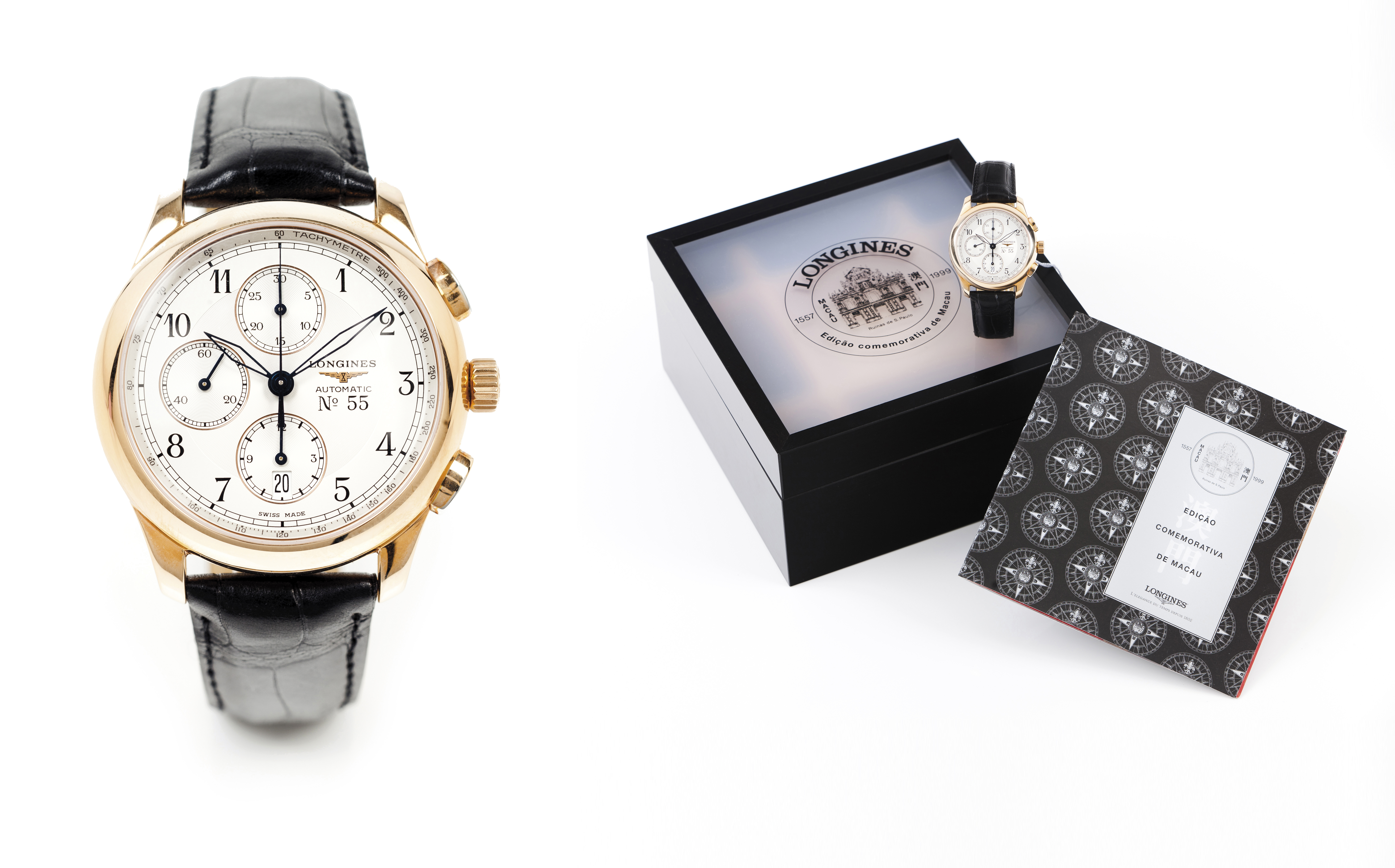 Relógio marca Longines, edição comemorativa de Macau de apenas 90 relógios, sendo este o 55. Movimento mecânico automático com data às 6h e função cronógrafo. Caixa em ouro (750). Estojo externo e interno e toda a documentação. Sem uso aparente.