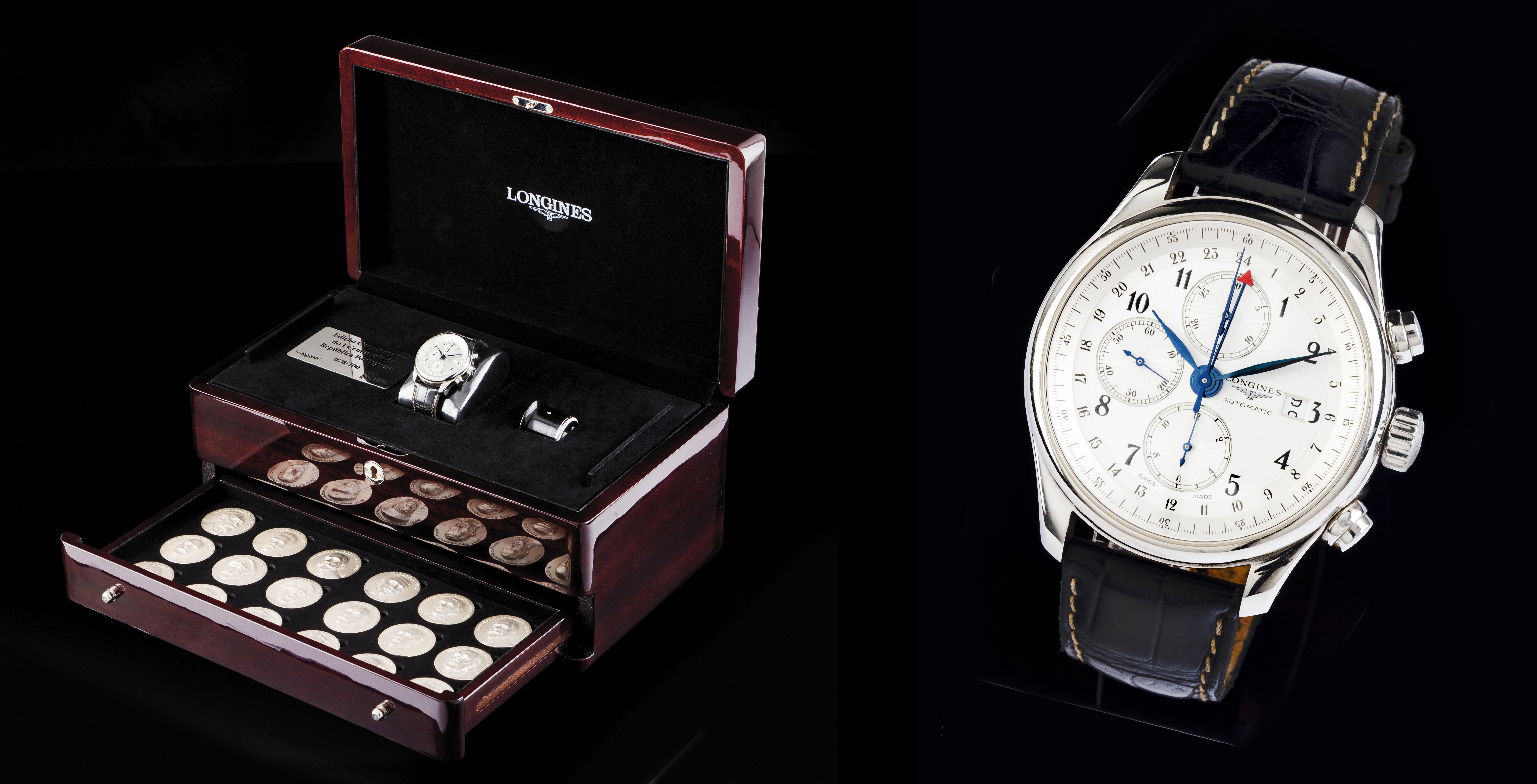 Edição comemorativa do 1º Centenário da República Portuguesa Nº76/100. Movimento Mecânico automático com função cronógrafo, GMT e com data às 15h. Caixa em aço. Conjunto completo com, livro, 18 medalhas com os bustos dos Presidentes da República gravados em alto-relevo, lupa, caixa e documentos. Em excelente estado de conservação.