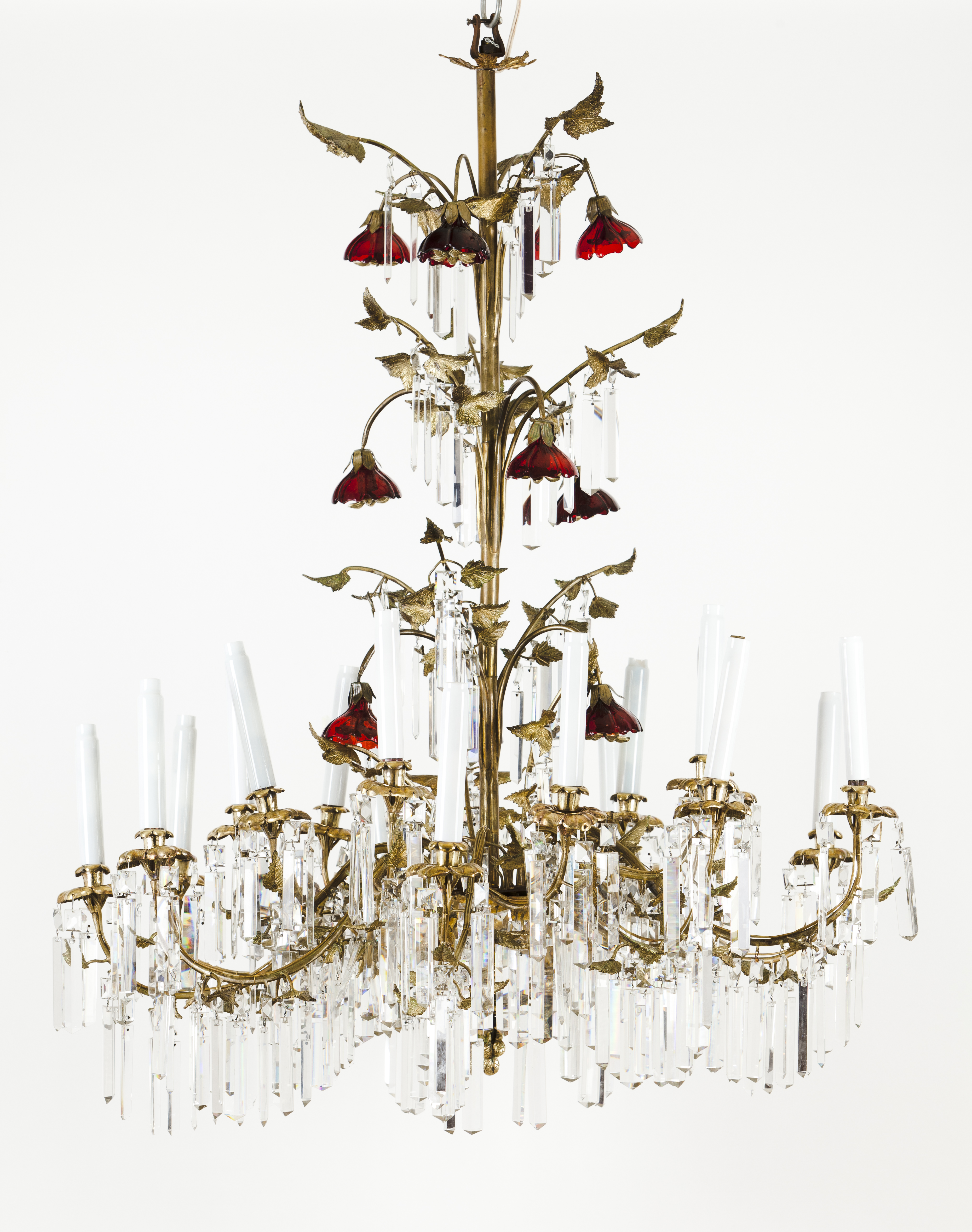 Decorado com ramos, folhas e flores com pétalas em vidro vermelho