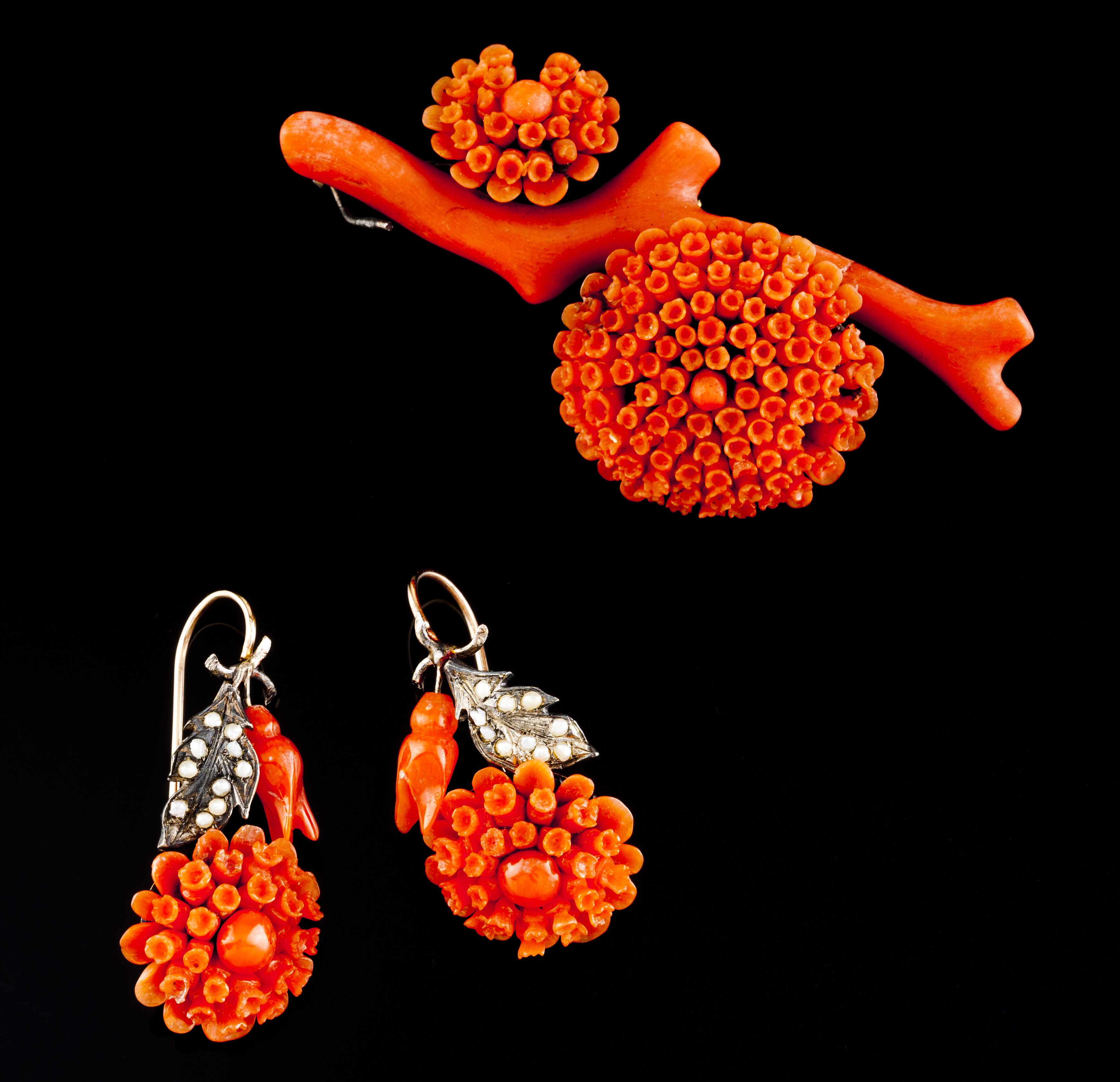 Aplicação de 1/2 pérolas e coral do Mediterrâneo esculpido