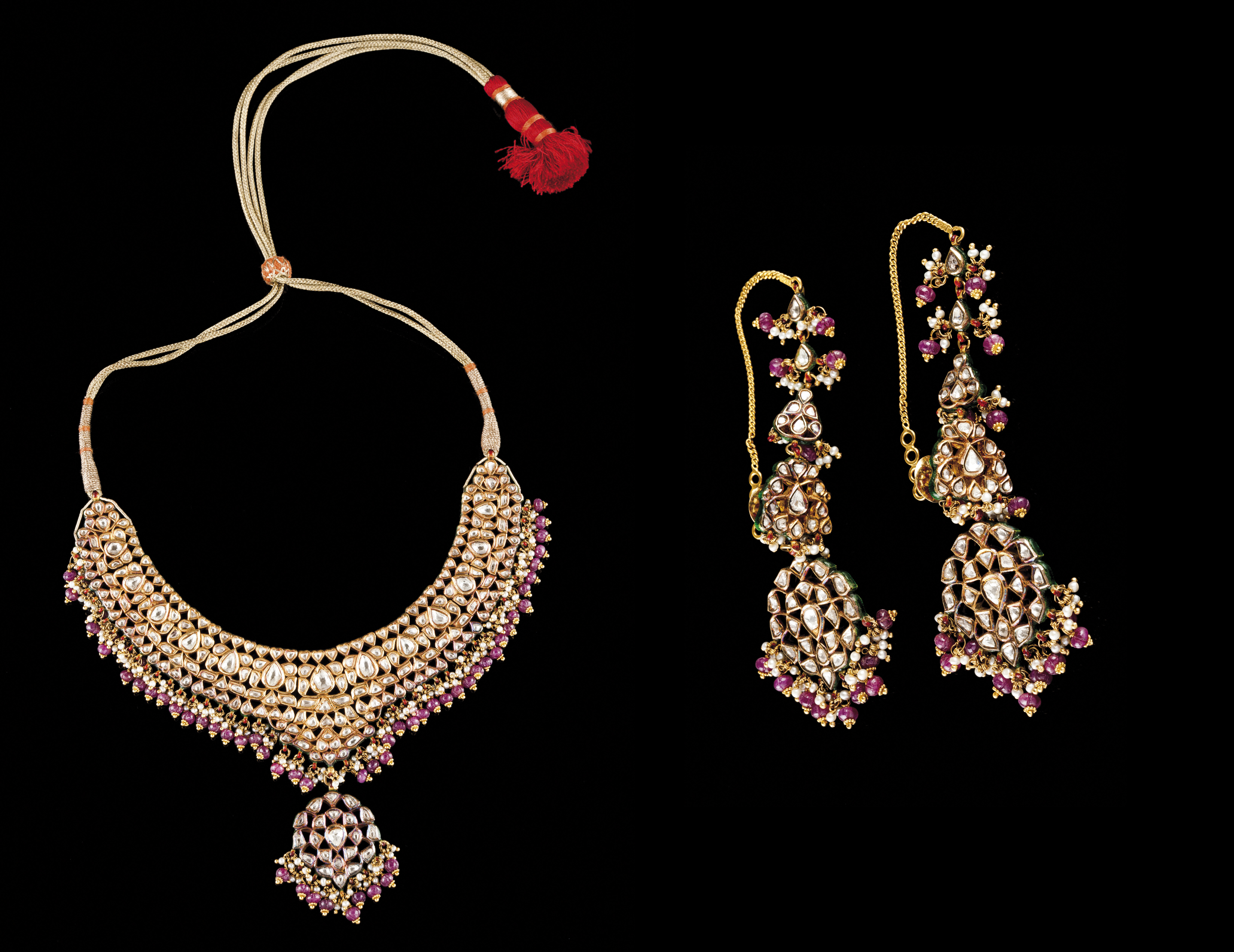 Composto por gargantilha e brincos cravejados com diamantes em talhe irregular e pequenos pingentes em rubi esculpido e micropérolas