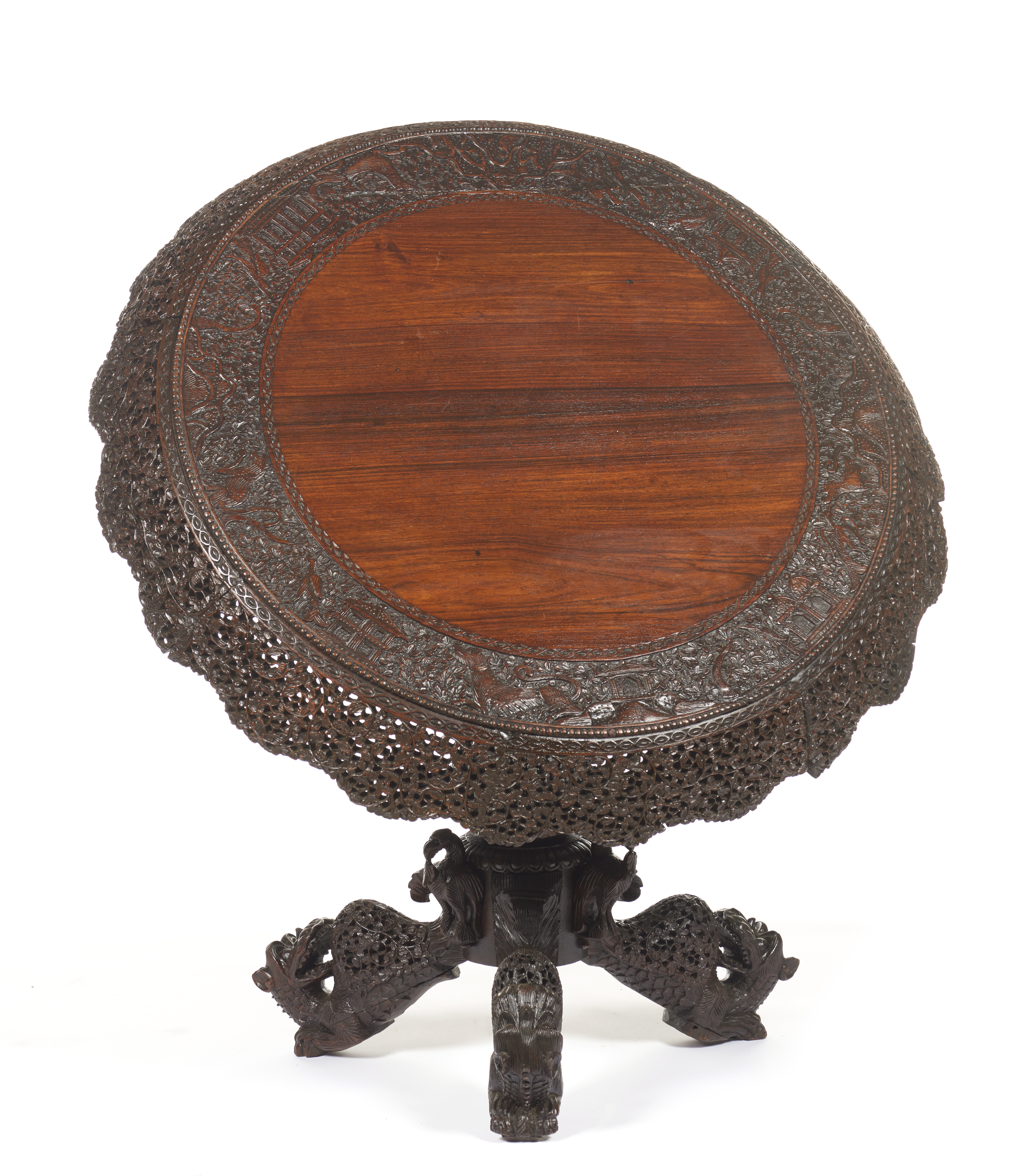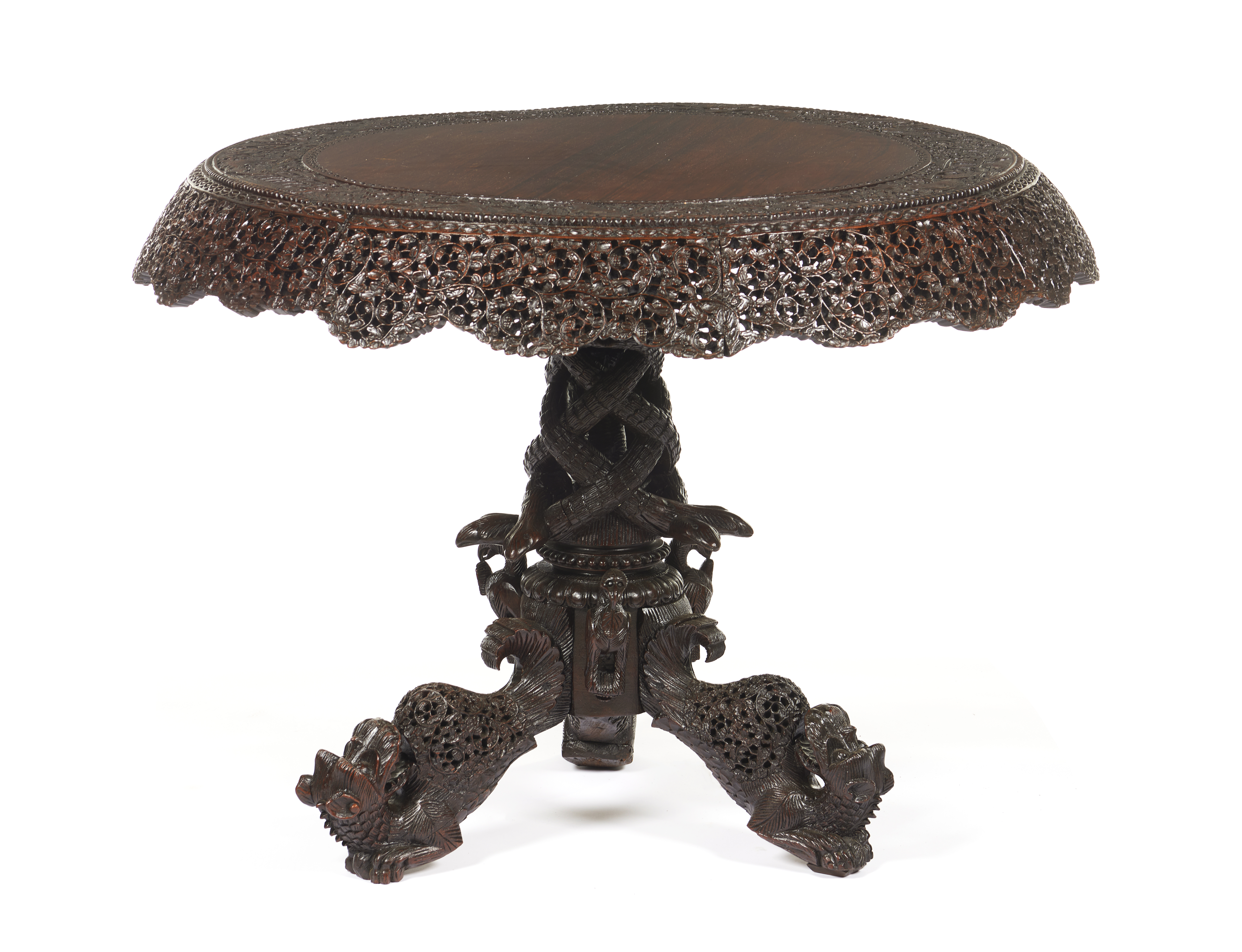 Em sissó, com profusa decoração entalhada, tampo basculante e coluna central com três pés
