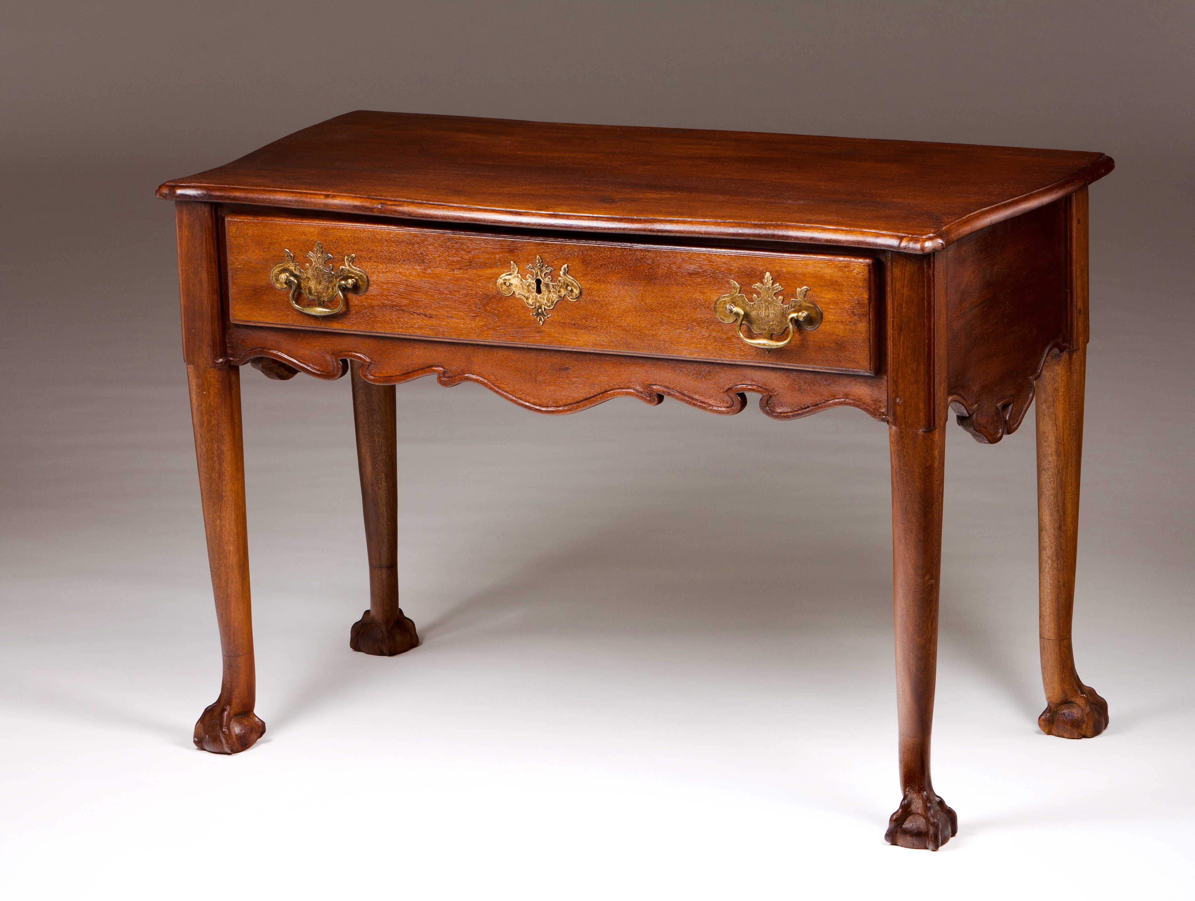 Com uma gaveta, saial recortado, ferragens em metal amarelo com decoração incisa e pés em garra e bola