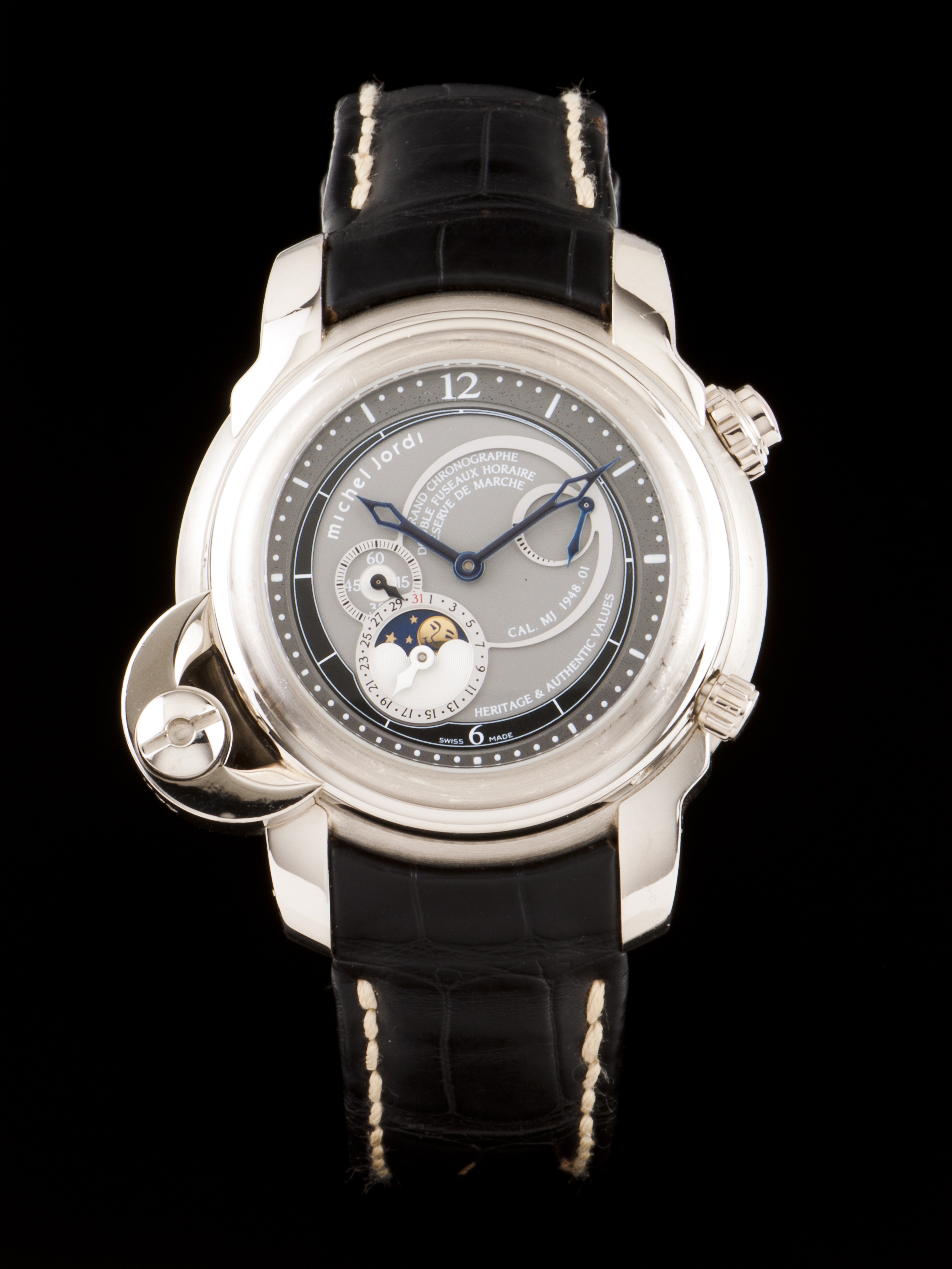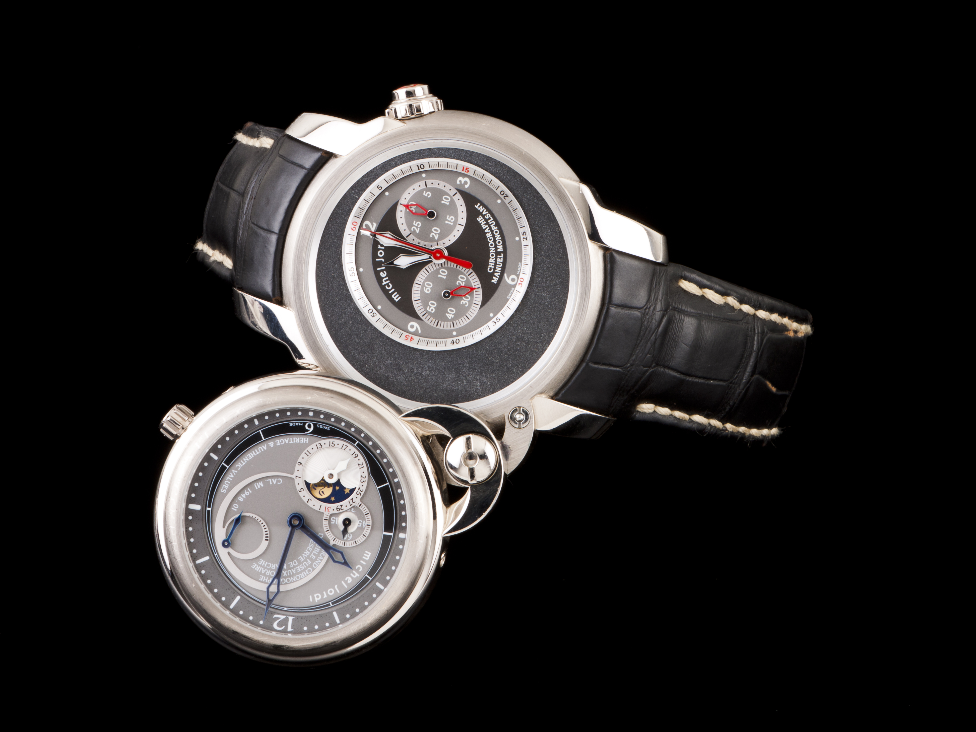 Raro relógio Michel Jordi, edição limitada de apenas 99 peças, sendo esta a nº 51. Relógio com dois movimentos mecânicos de corda manual independentes, um com data, fases da lua e reserva de marcha e outro com cronógrafo monopulsante. Peça toda em ouro branco (750/000)t com 44mm de diâmetro. Pulseira em pele preta com fivela em ouro branco. Ligeiros sinais de uso. (220g PB)