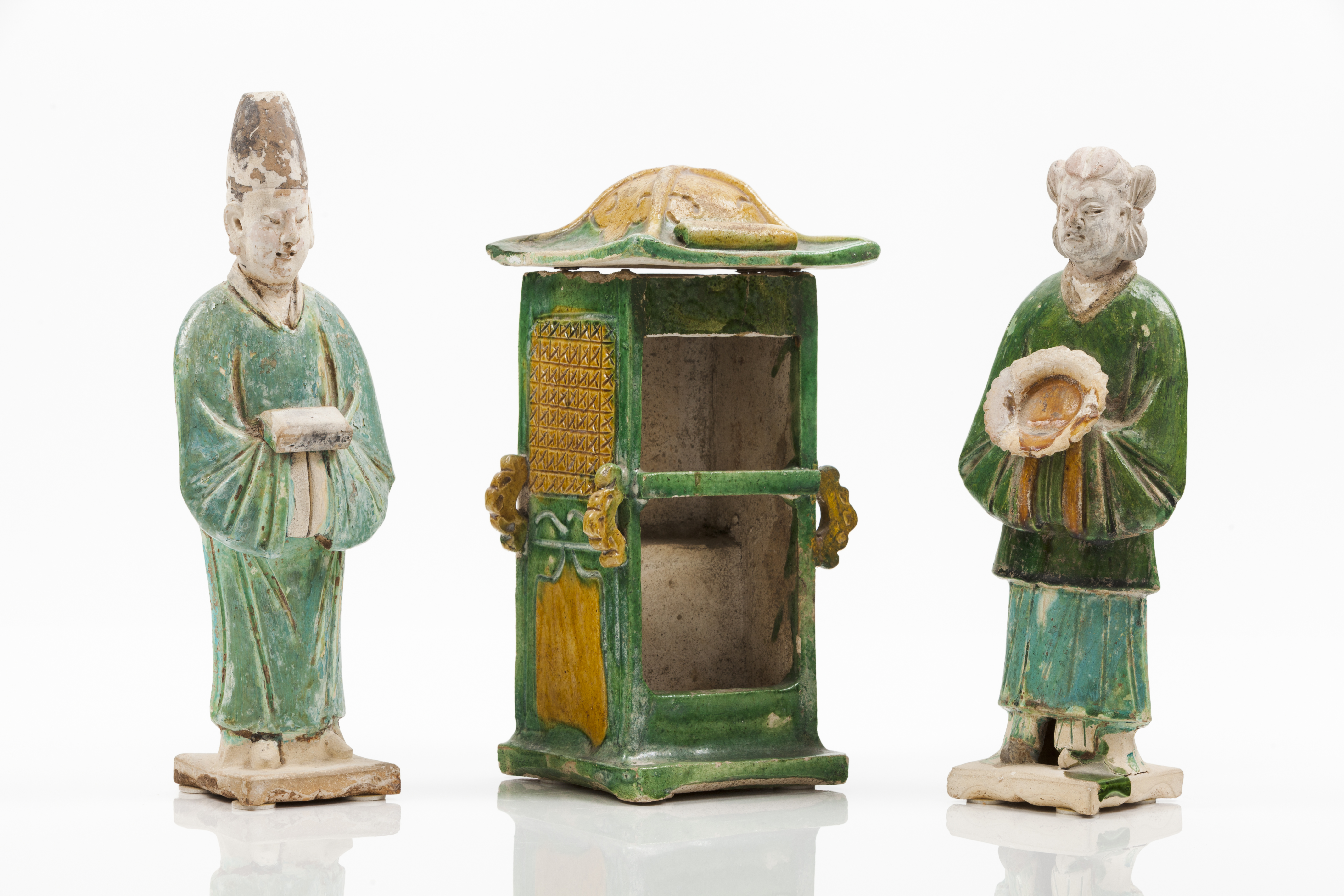 Conjunto de três esculturas em cerâmica vidrada Sancai