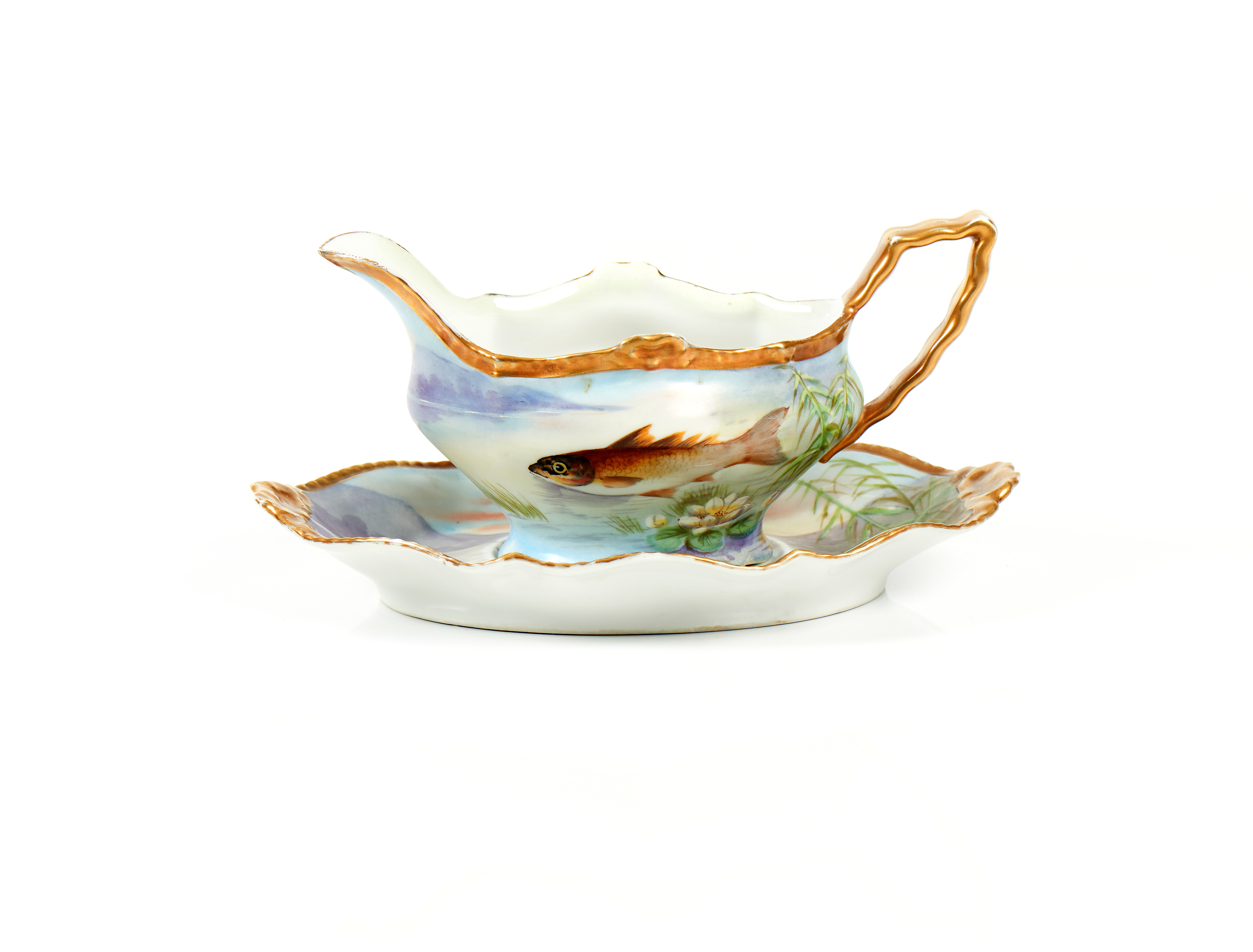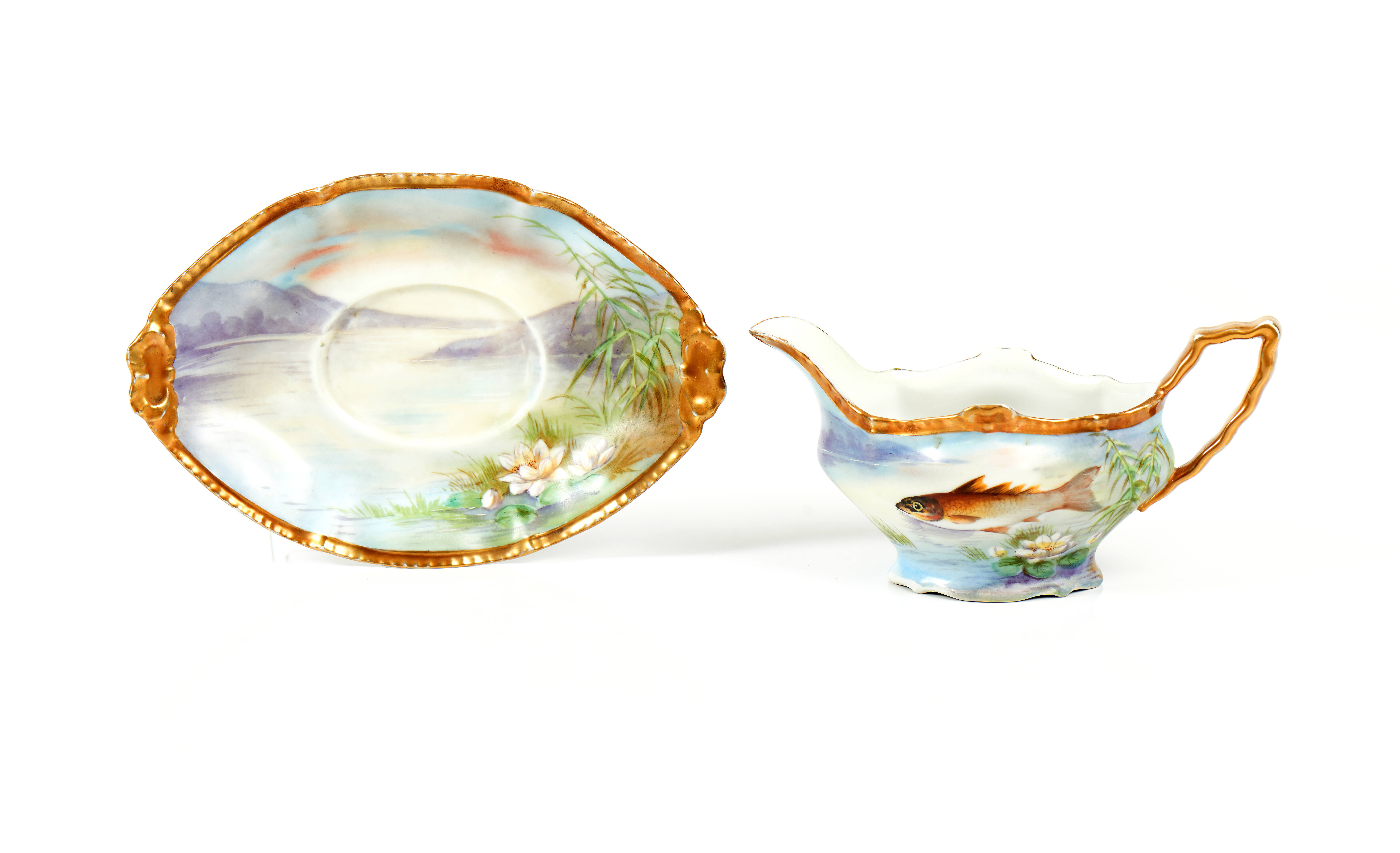 Porcelana de Limoges com decoração manual de peixes sobre fundo de lago e paisagem montanhosa.