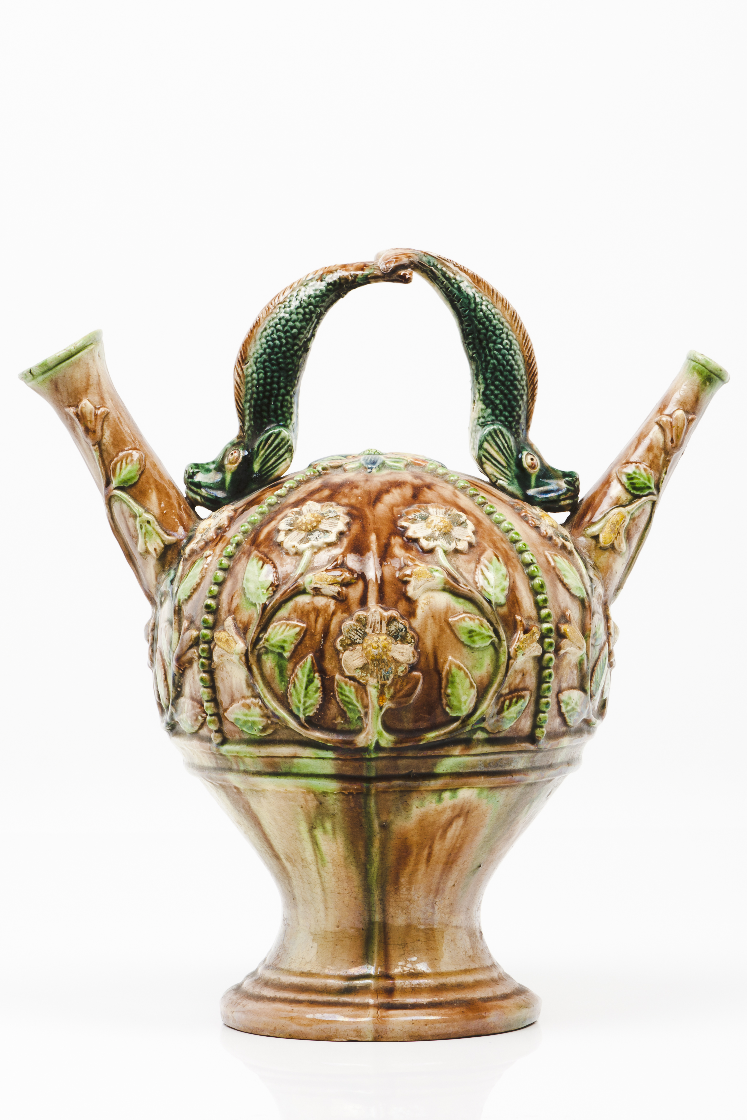Decoração policromada e relevada representando flores e contas, com asa em forma de peixes
