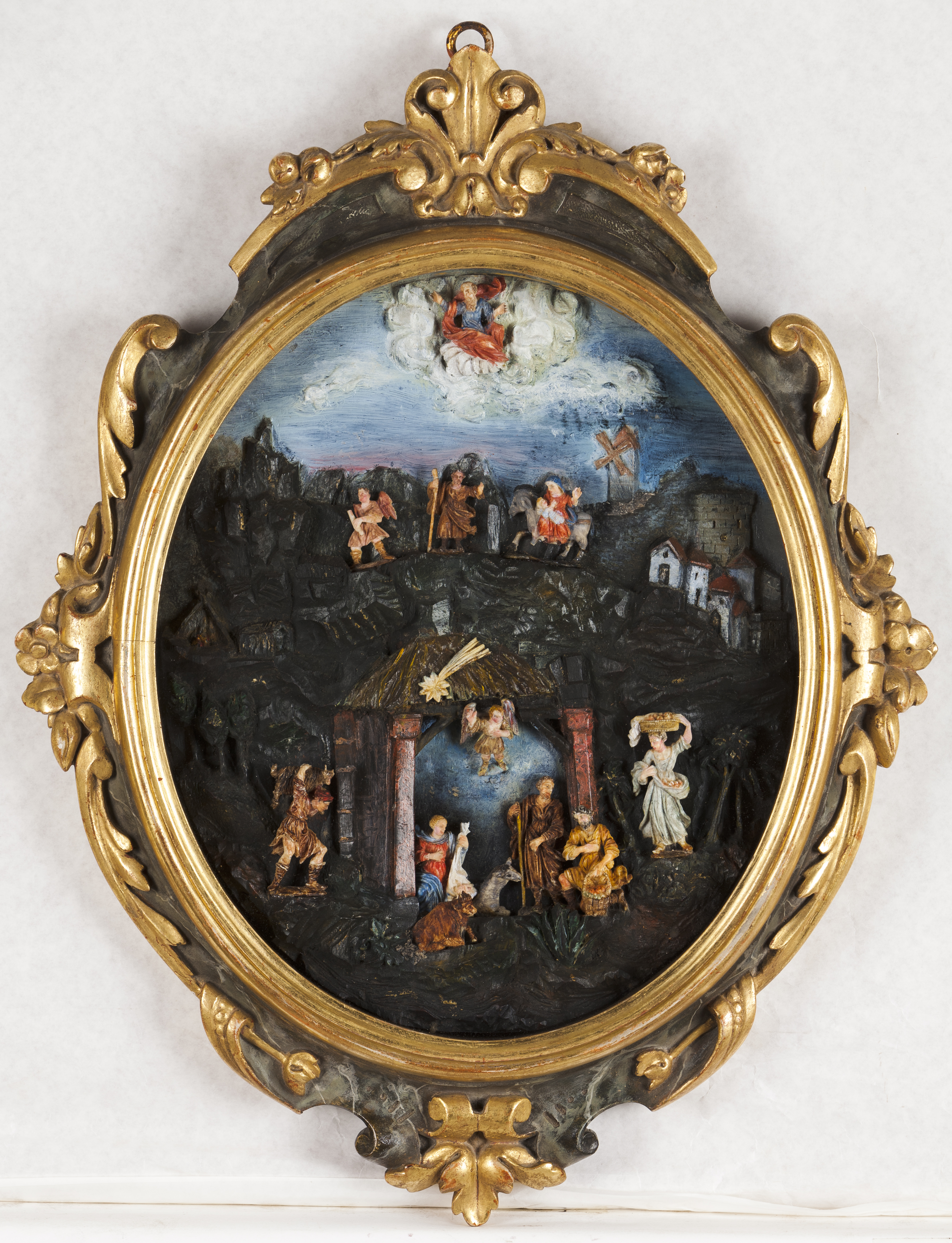 Medalhão em madeira entalhada e pintada com figuras em osso esculpido policromado