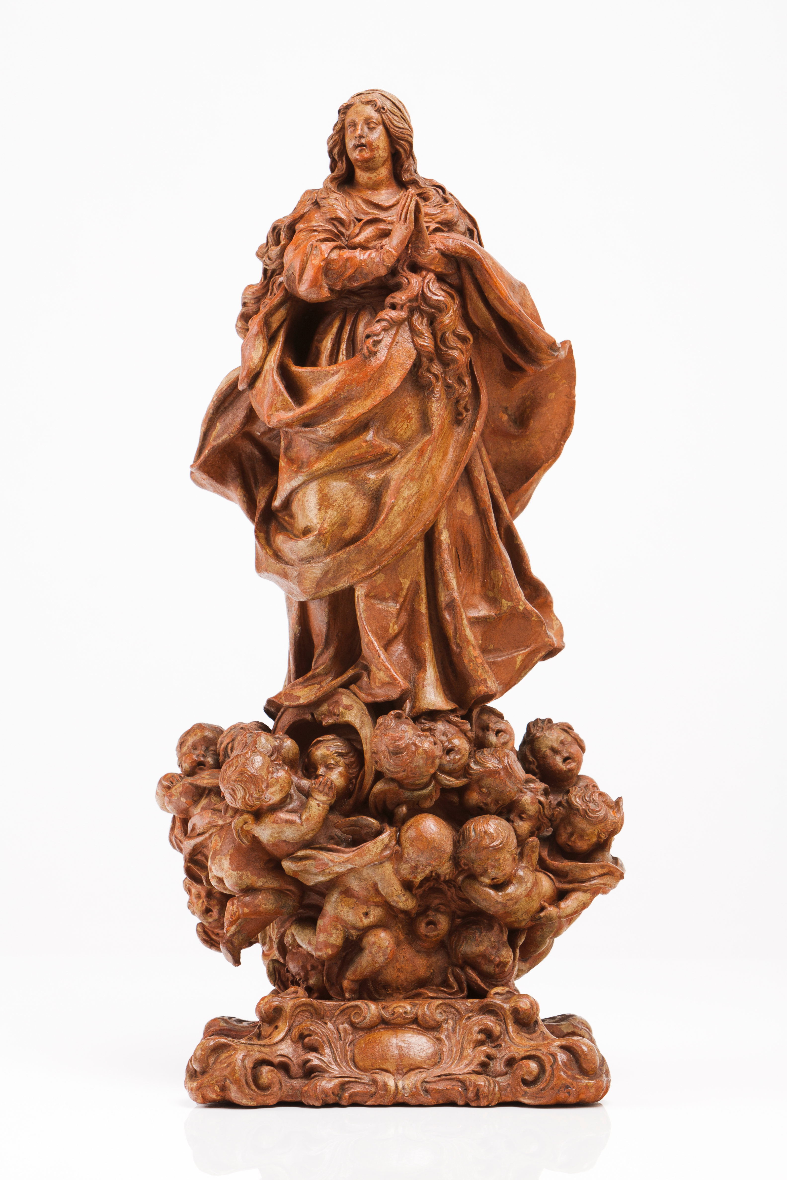 Representando Nossa Senhora da Conceição com as mãos postas em oração, cabelos longos e vestes graciosamente moldadas