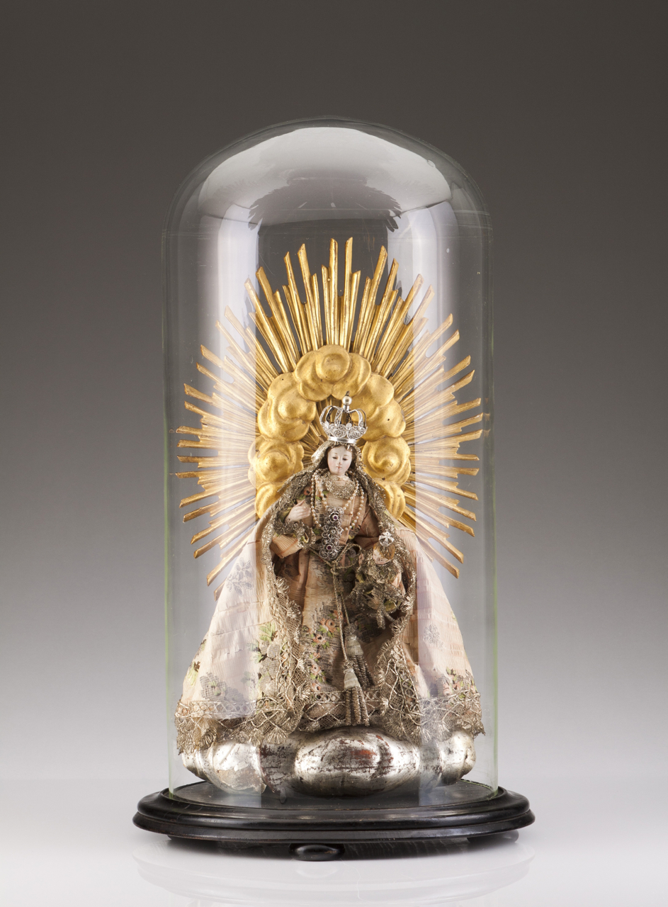 Peanha e resplendor em madeira pintada, prateada e dourada