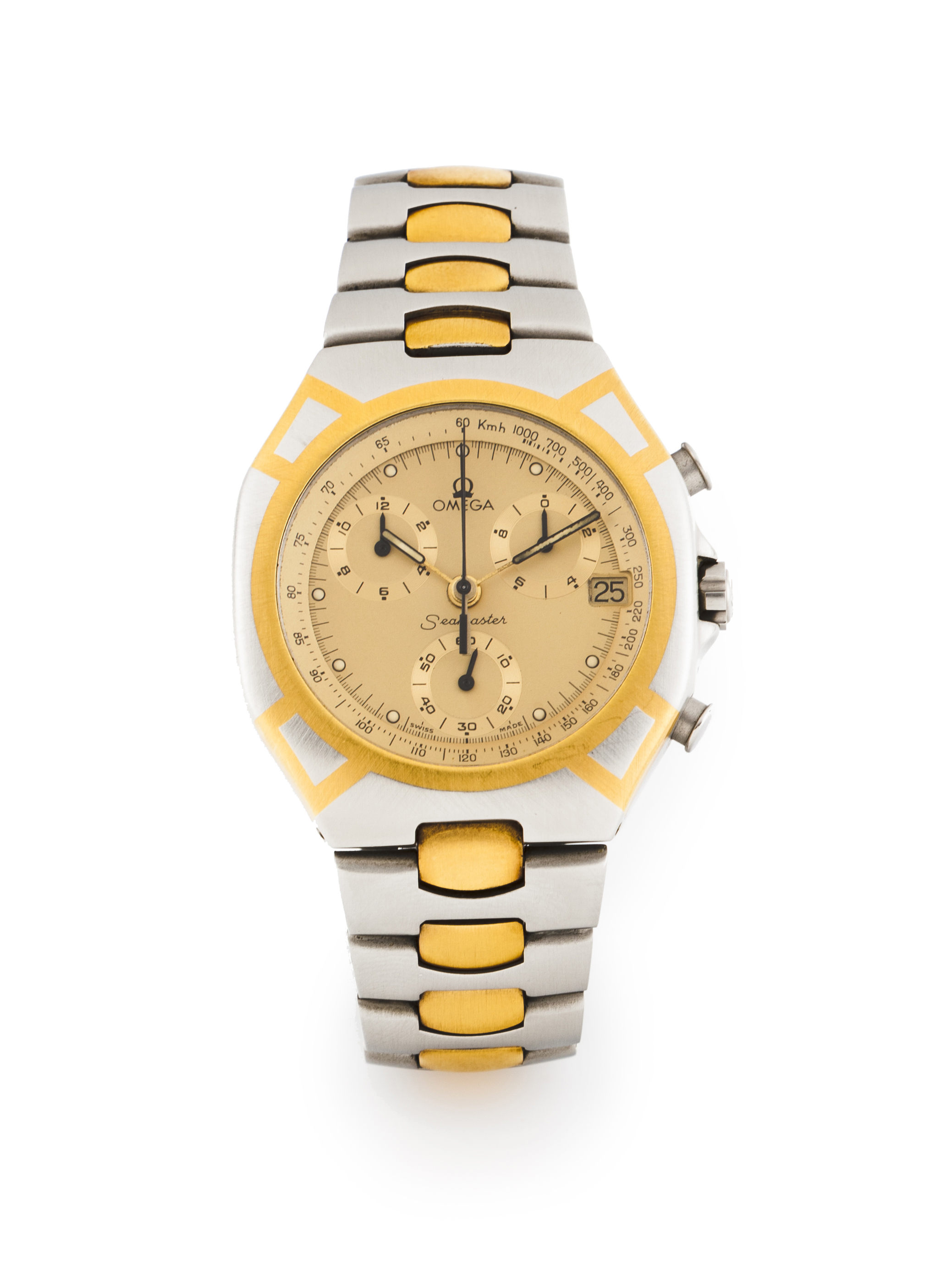 Modelo Seamaster Polaris. Movimento de quartzo com função cronógrafo e data às 15h. Caixa e bracelete em aço e ouro. Em bom estado de conservação. Com caixa, sem documentos.