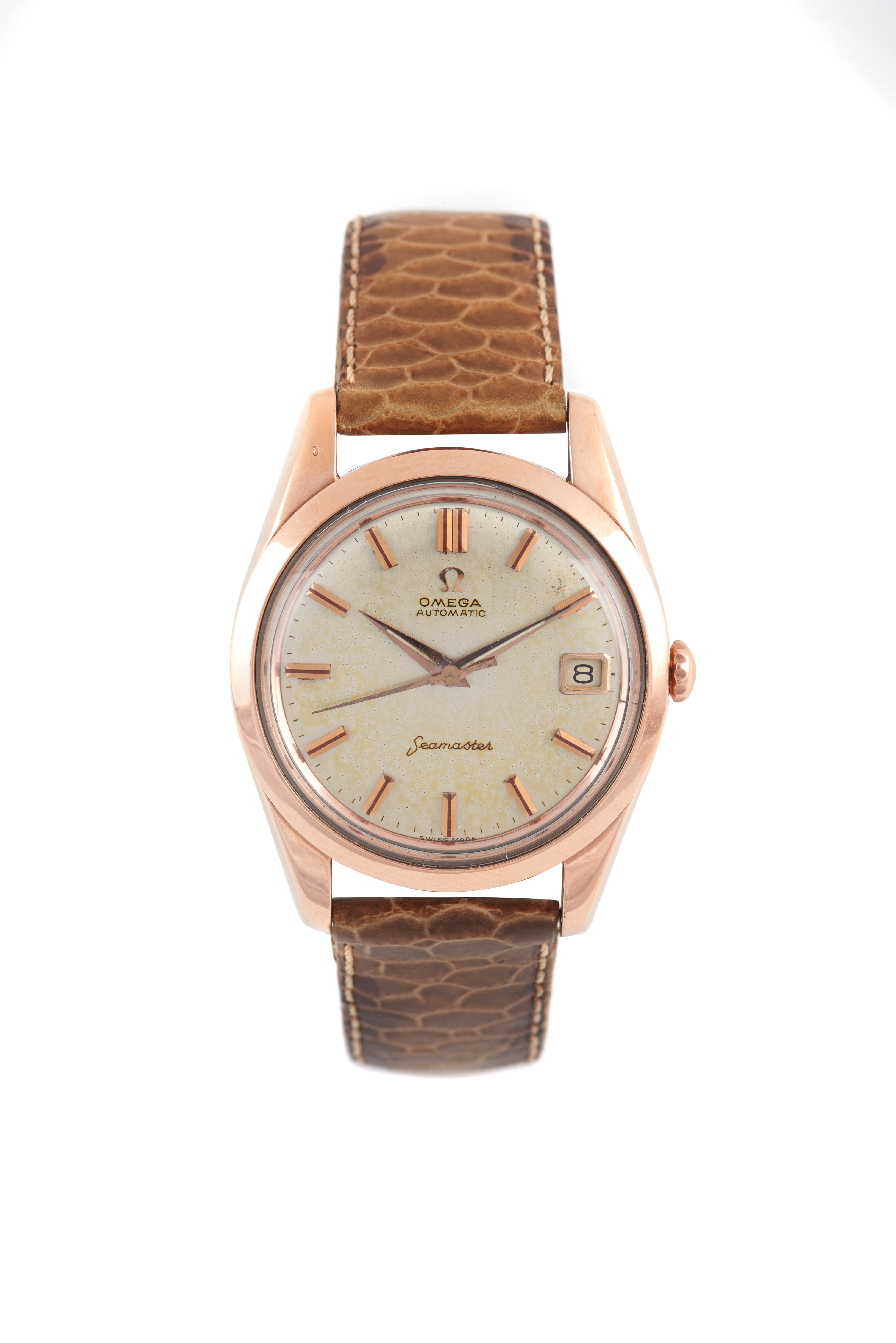 Modelo Seamaster. Movimento mecânico automático (Cal. 562) com data às 15h e com o nº de série 19645356. Caixa em aço folheada a ouro com a ref. nº 176005. Com marcas de uso.