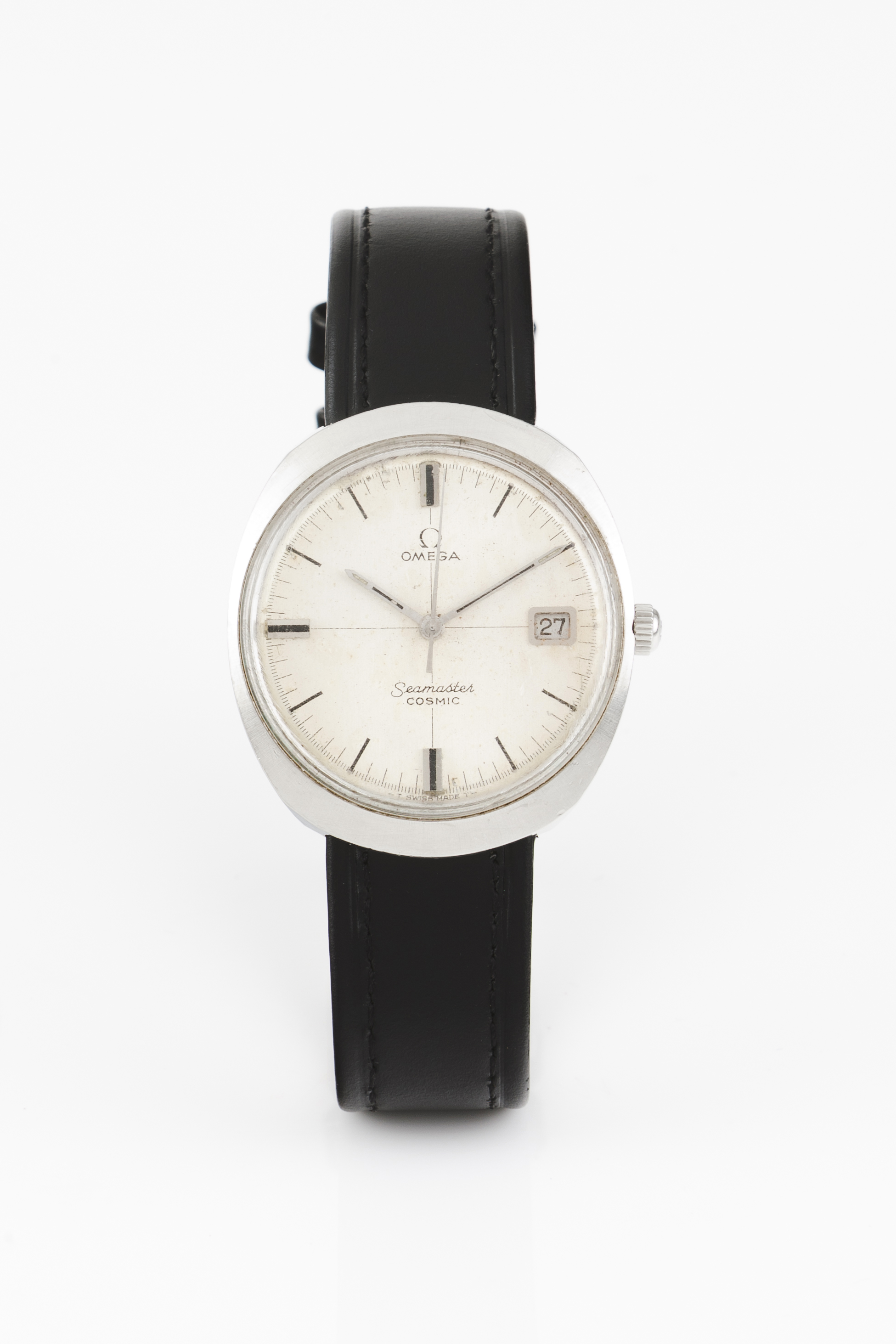 Relógio marca Omega modelo Seamaster Cosmic. Movimento mecânico automático (cal. 565) com data às 3h. Caixa em aço. Razoável estado de conservação.