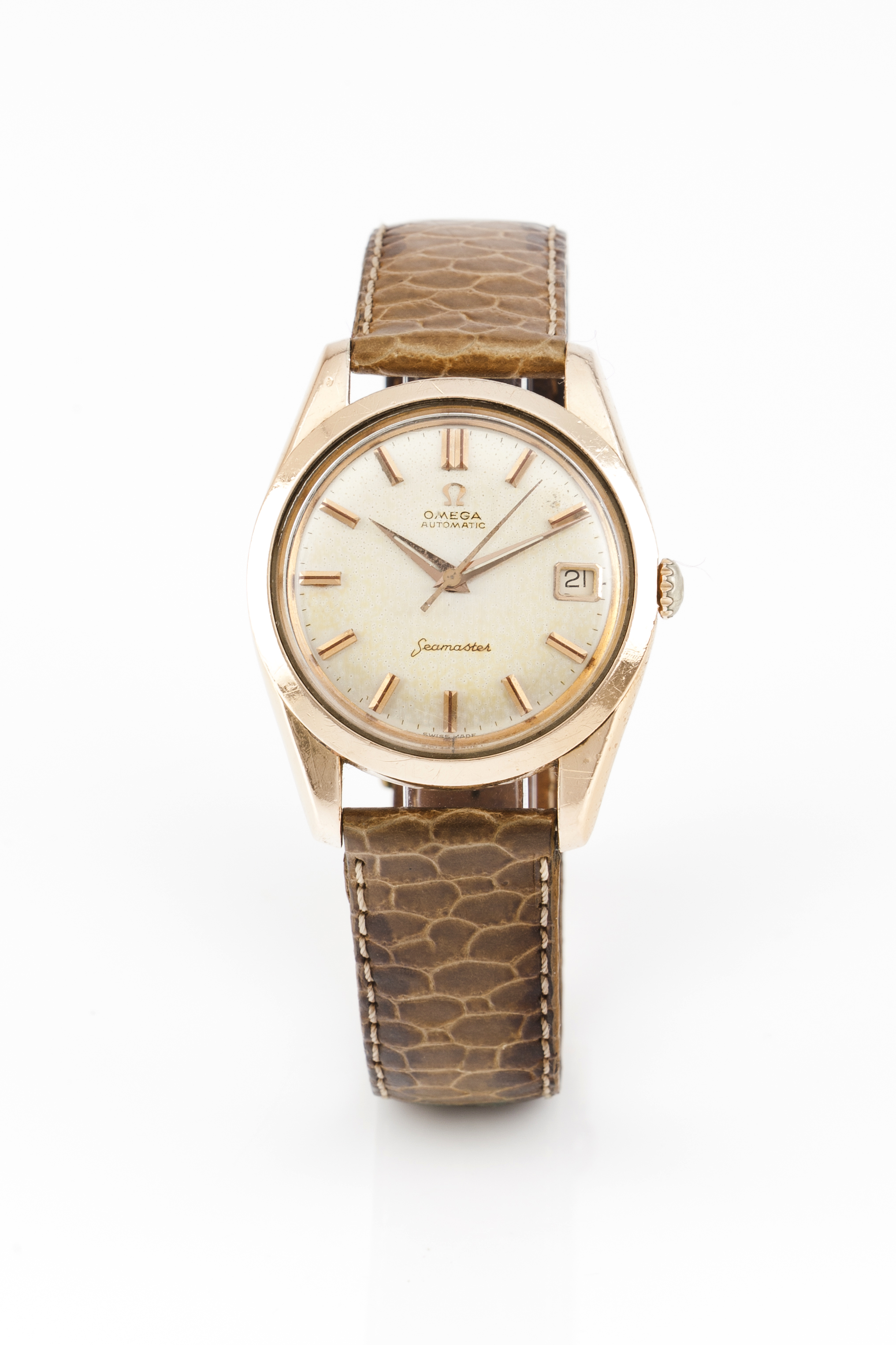 Relógio marca Omega modelo Seamaster. Movimento mecânico automático com data às 3h.Caixa em aço com folha de ouro. Com marcas de uso.