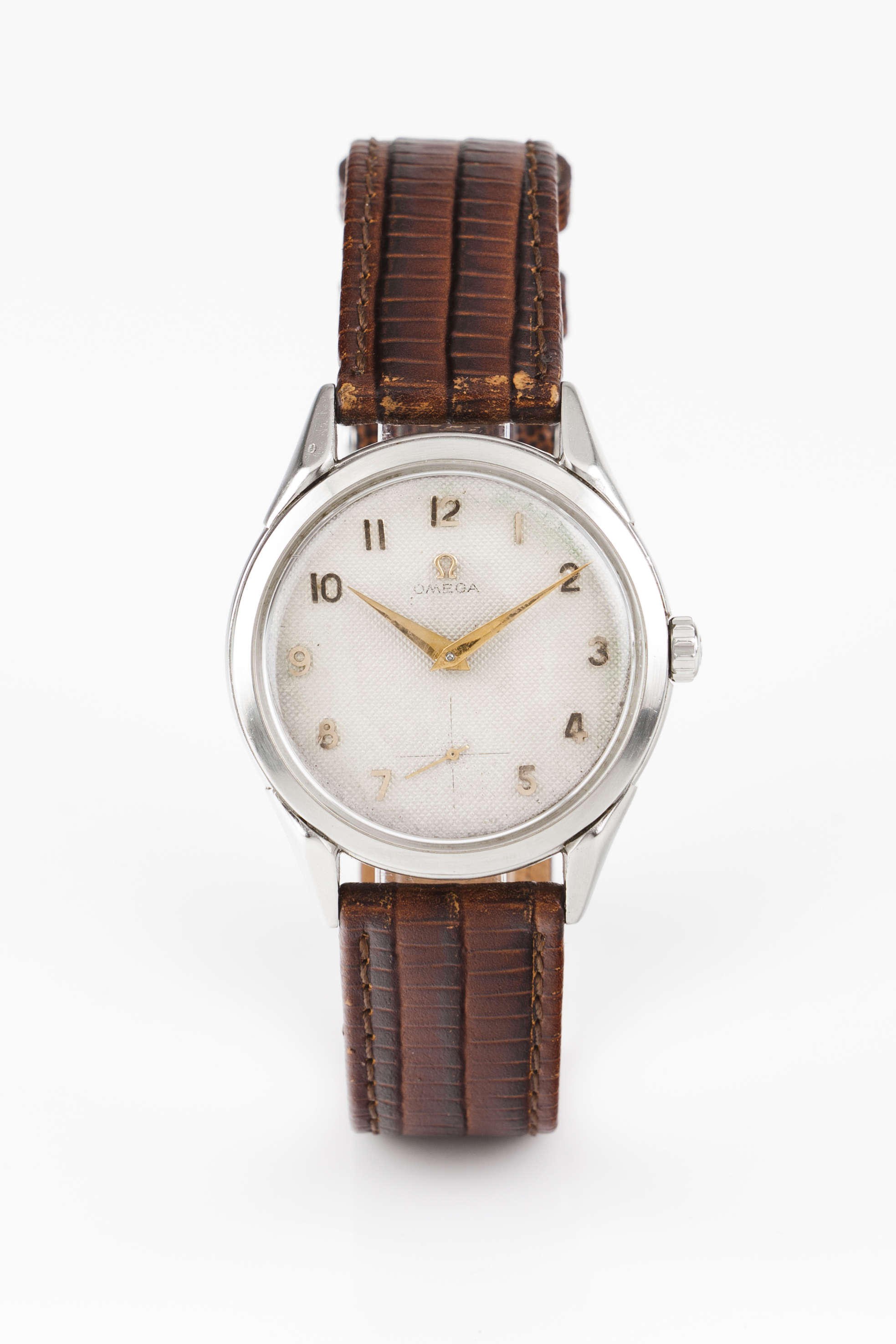 Relógio marca Omega. Movimento mecânico de corda manual com o número 12557886 (cal. 265). Mostrador honeycomb. Caixa e tampa em aço com o número 2605-4.Com marcas de uso.