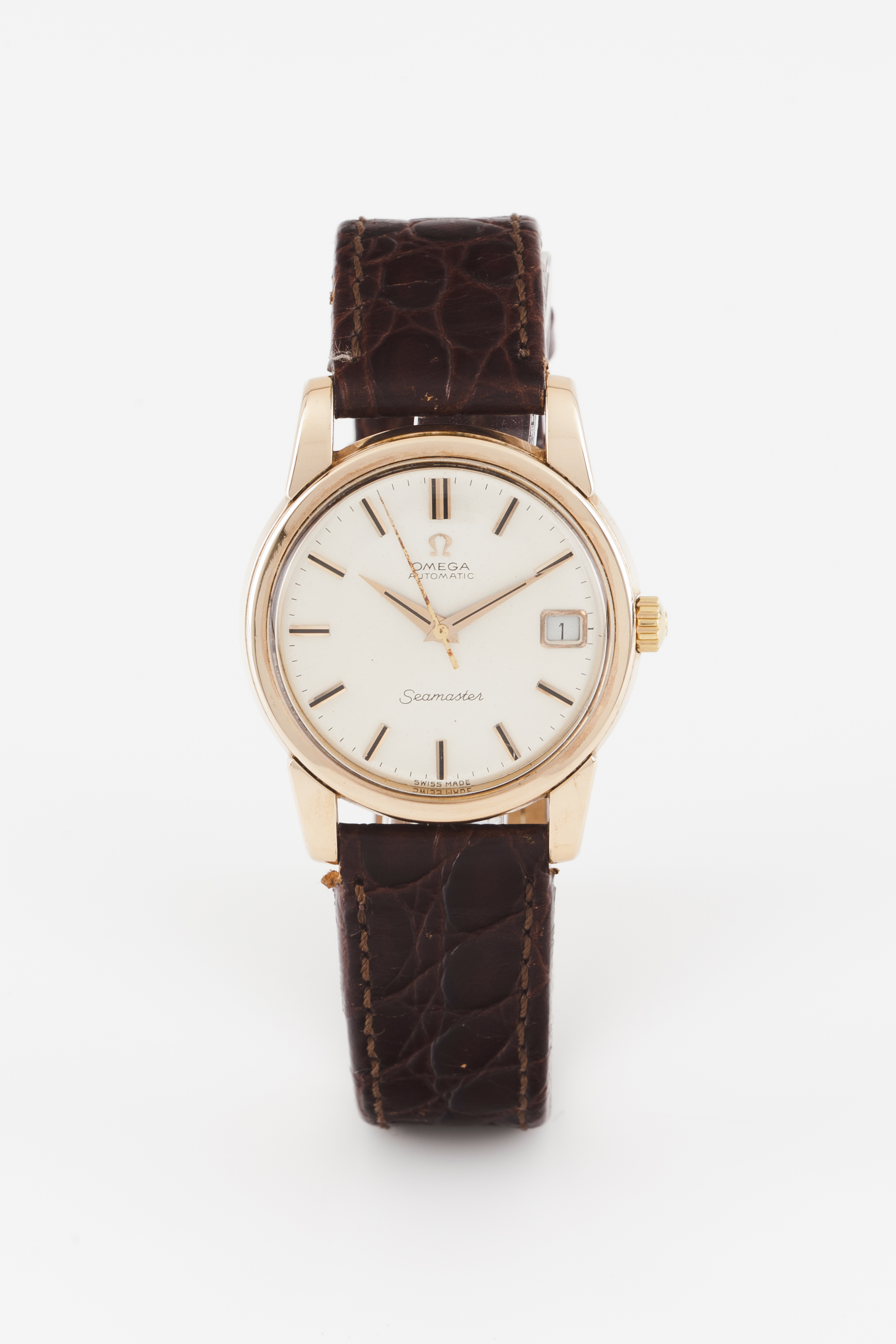 Relógio marca Omega. Modelo Seamaster. Movimento mecânico automático (cal. 562) com data às 3h e com o número 222768470. Caixa em plaquê com tampa em aço com o número 166.009. Em bom estado de conservação.