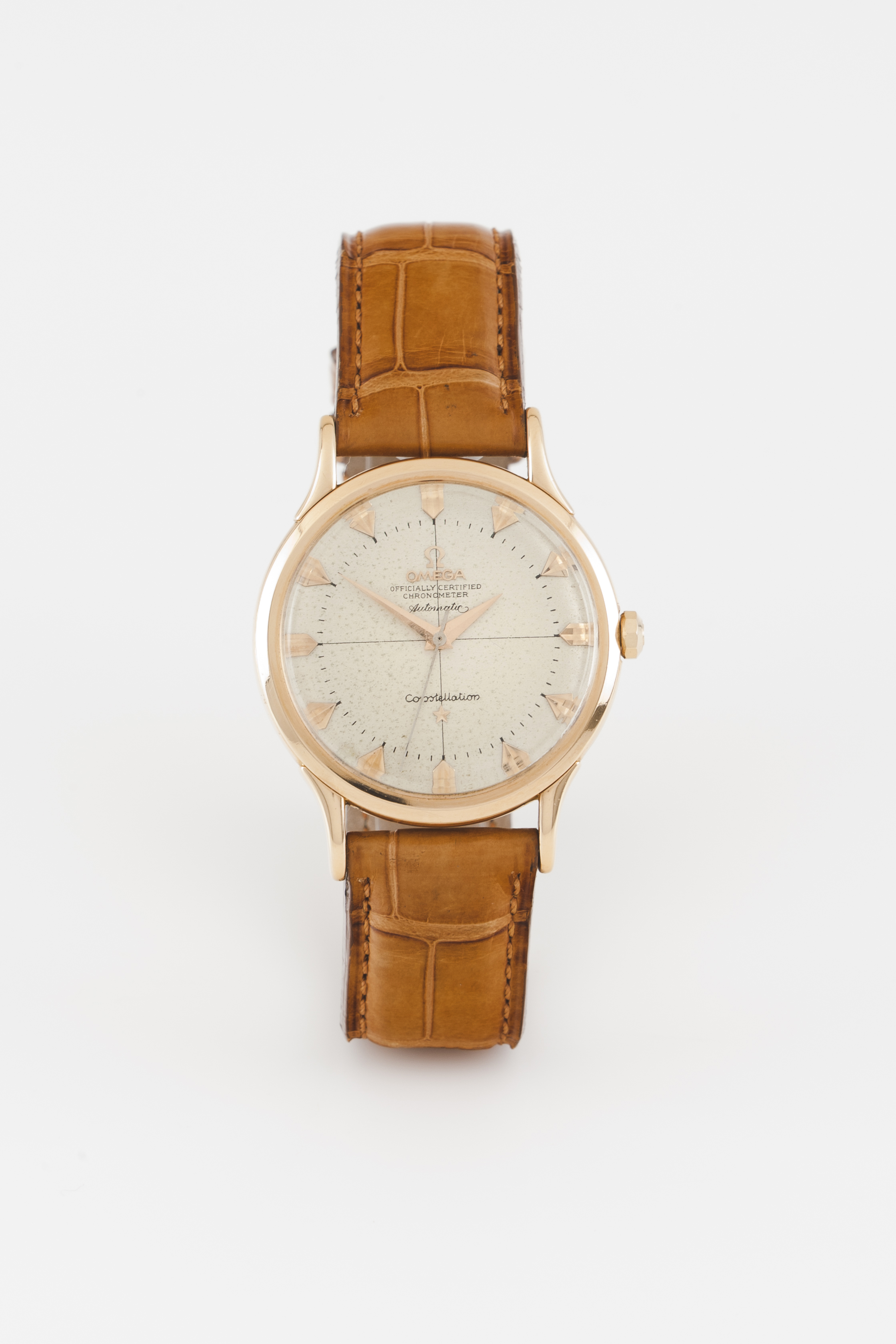 Relógio marca Omega. Modelo Constellation. Movimento mecânico automático (Cal.352 - Bumper) com o número 12722067. Caixa em ouro (750/000) com número de tampa 11120957 2700 SC. Em bom estado de conservação.