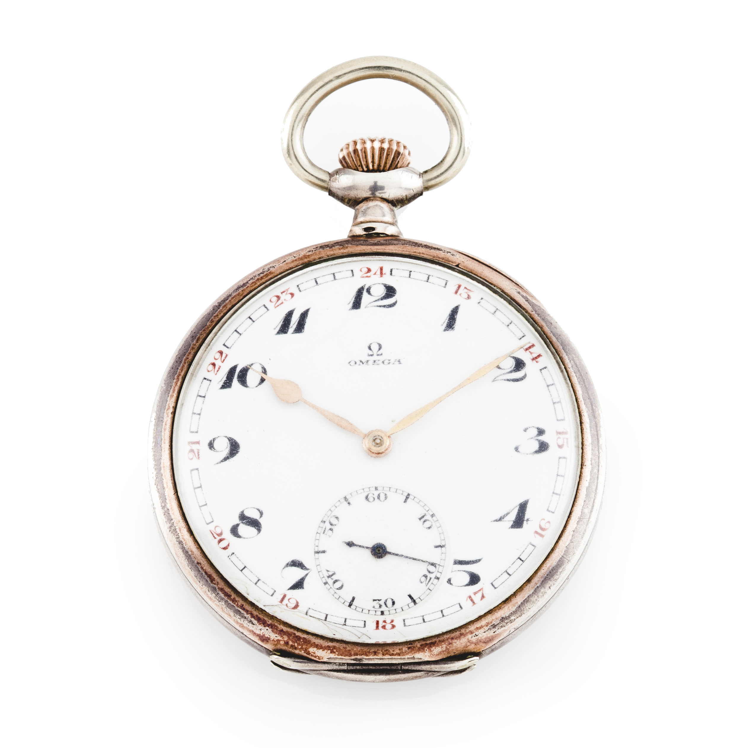 Relógio de Bolso. Movimento mecânico de corda manual com regulação e Nº de série 6871352. Caixa em prata (800/000) com duas tampas. Mostrador com numeração árabe. Com marcas de uso.