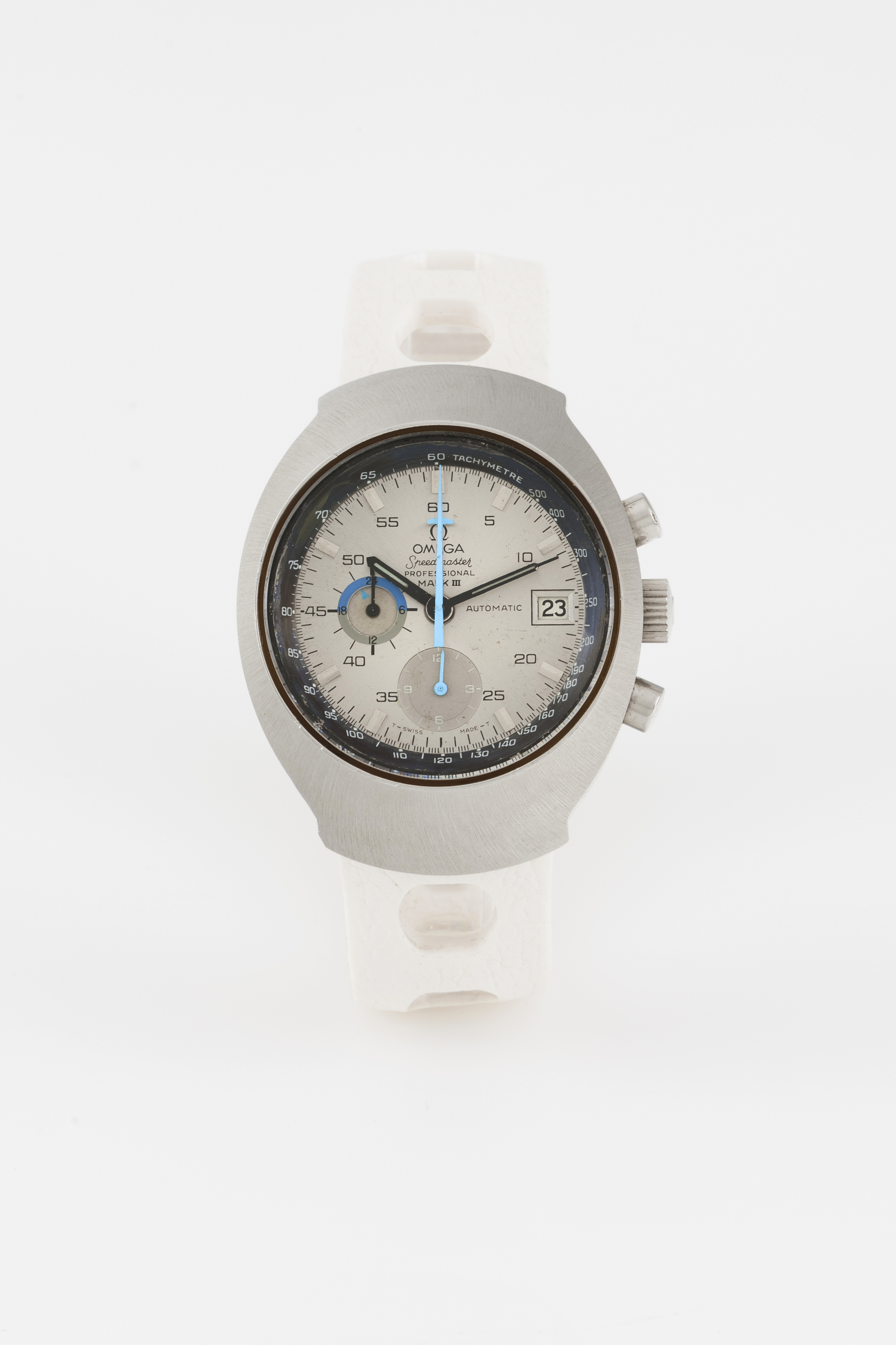 Relógio marca Omega. Modelo Speedmaster Professional Mark III. Movimento mecânico automático (Cal. 1040) com data às 3h e função cronógrafo. Caixa em aço com número de tampa 176.002. Em razoável estado de conservação.