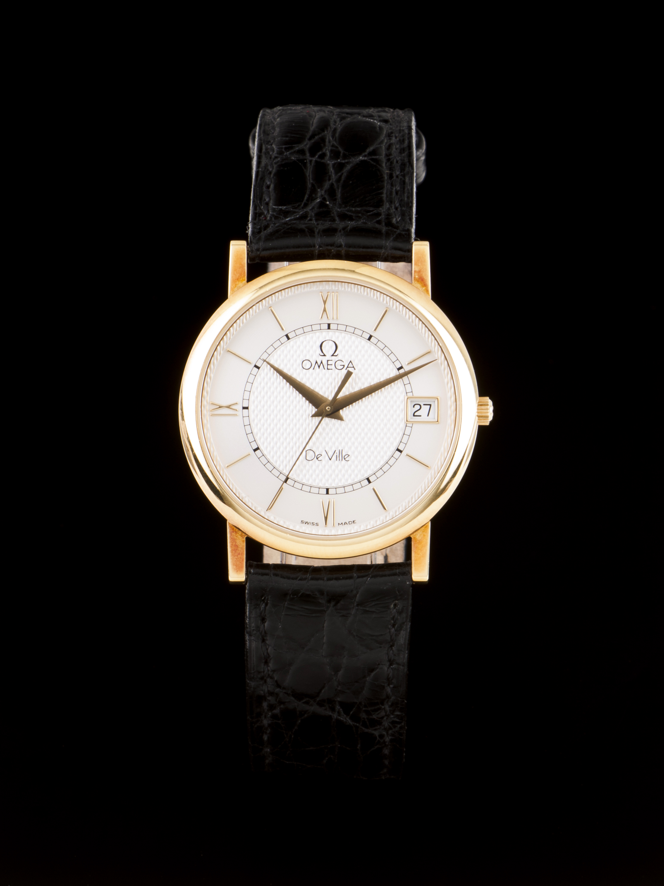 Relógio Omega de homem, modelo DeVille em ouro com caixa de 33mm de diâmetro. Movimento de quartzo, cal 1532, com data. Peça de 1998 com caixa interna, externa e alguma documentação. A funcionar à data da avaliação.