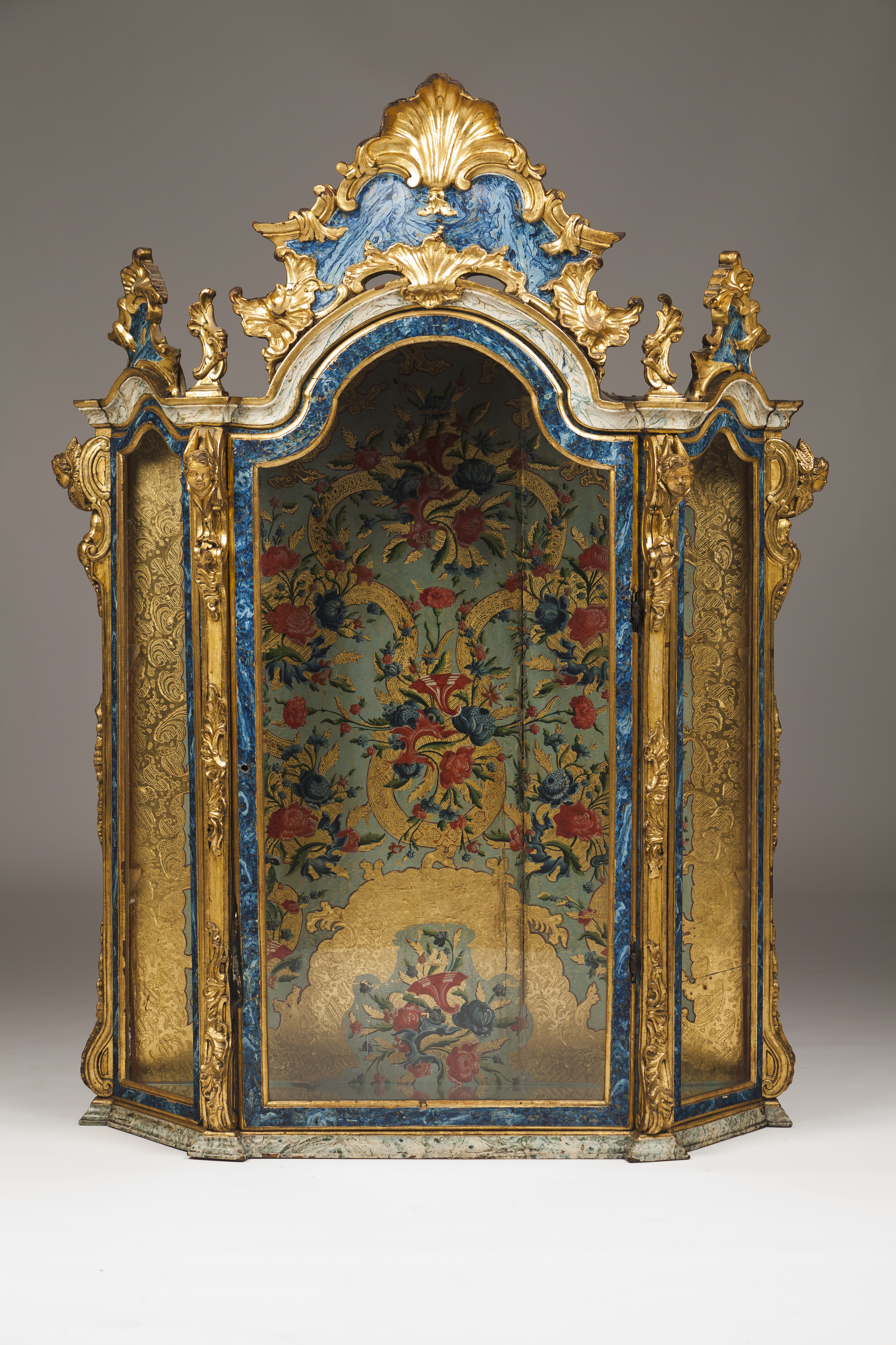 Em madeira entalhada, dourada e marmoreada com concheados, motivos vegetalistas e cabeças de querubins