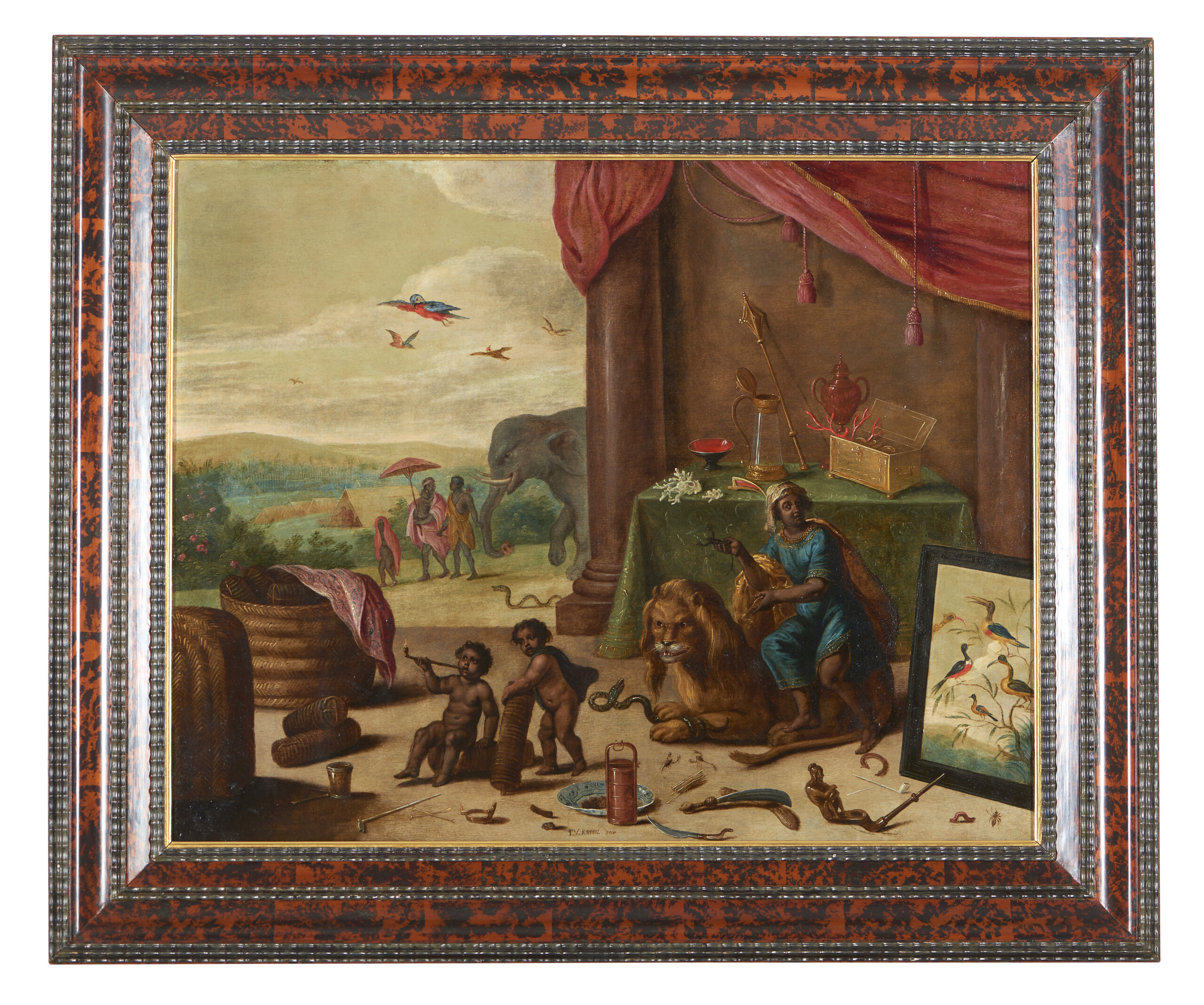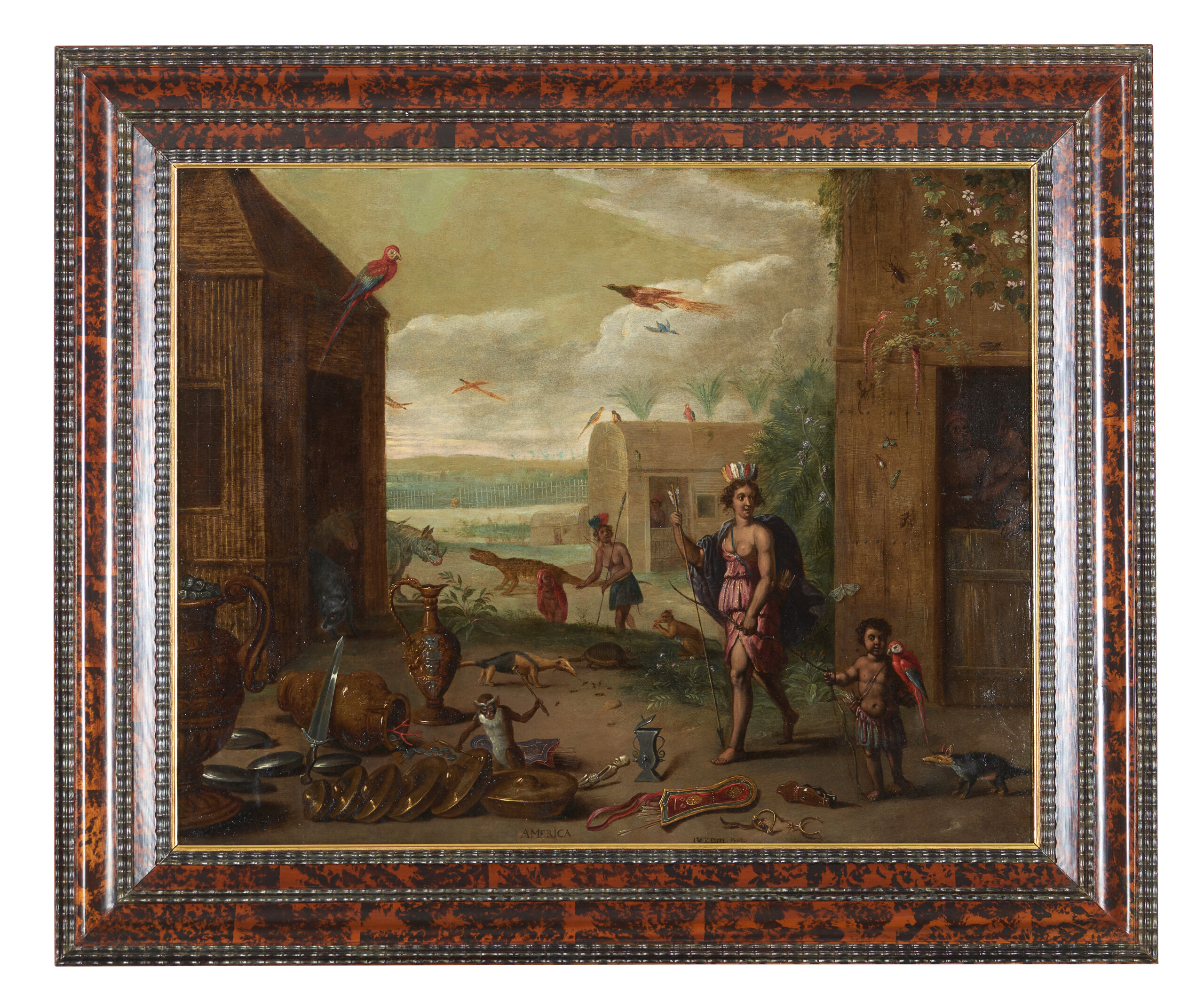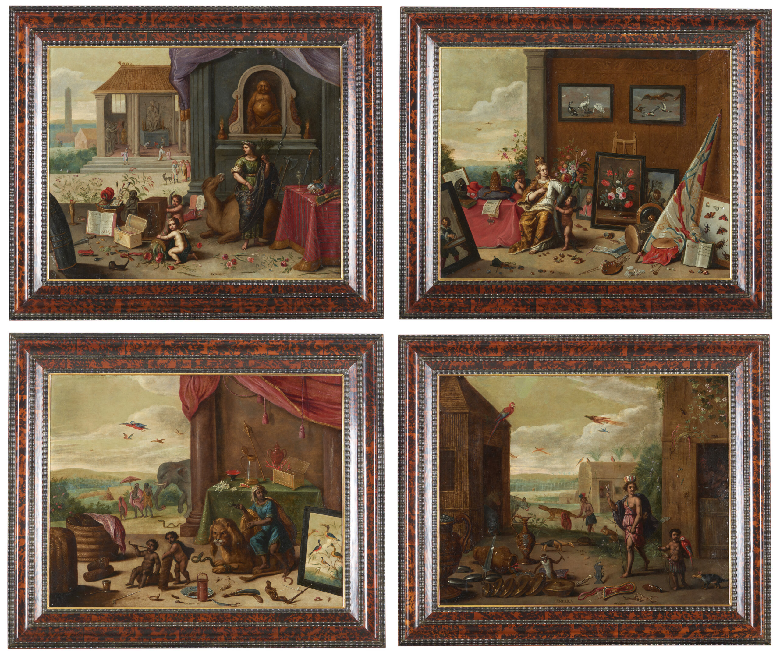 Esses conjuntos são compostos por quatro painéis centrais — aos quais as quatro obras aqui apresentadas se relacionam de perto —, cada um rodeado por dezasseis painéis mais pequenos com paisagens, animais e (por vezes imaginários) perfis urbanos ao longe. Uma segunda série, incompleta, de 1660, hoje no Museu do Prado, em Madrid, resume-se actualmente a 40 painéis pequenos.(2) Van Kessel realizou outros conjuntos compostos deste género, por exemplo com estudos de insectos.(3) Isso não significa, contudo, que o conjunto dos Quatro Continentes aqui apresentado tenha pertencido originalmente a uma compilação desse tipo. Estas pinturas são maiores do que os outros exemplos conhecidos, o que exigiria painéis envolventes com outras medidas. Não parece haver registo de tais painéis.
